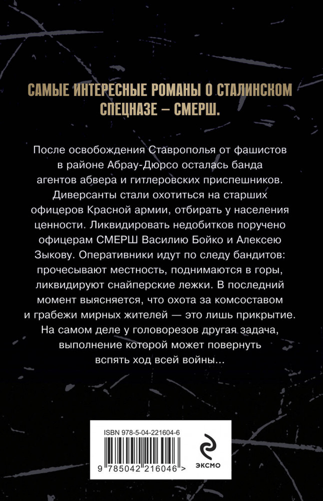 Серия: Солдаты СМЕРШ. Романы о неизвестных боях. Новое оформление (обложка) После освобождения Ставрополья от фашистов в районе Абрау-Дюрсо осталась банда агентов абвера и гитлеровских приспешников. Диверсанты стали охотиться на старших офицеров Красной Армии, отбирать у населения ценности. Ликвидировать недобитков поручено офицерам СМЕРШа Василию Бойко и Алексею Зыкову. Оперативники идут по следу бандитов: прочесывают местность, поднимаются в горы, ликвидируют снайперские лежки. В последний момент выясняется, что охота за комсоставом и грабежи мирных жителей — это лишь прикрытие. На самом деле у головорезов другая задача, выполнение которой может повернуть вспять ход всей войны... |