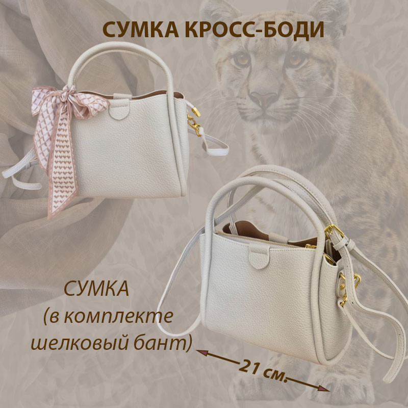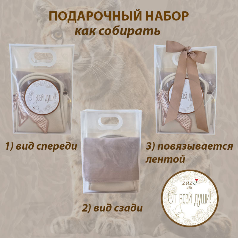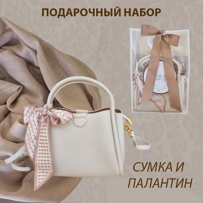 Представляемый подарочный набор состоит из комплекта: сумка и палантин, которые безупречно дополняют друг друга. Бежевый палантин (180×80 см) удивительно нежный, легкий и приятный на ощупь. Компактная сумка (20×11×18 см) белого цвета, выполнена в классическом стиле. Её лаконичный дизайн, обязательно привлечет внимание окружающих! Сумка имеет три отделения, один из которых застегивается на молнию. Среднее отделение имеет также внутренний карман на молнии и карман без застежки. В комплектацию входит отстегивающийся плечевой ремень, который легко регулируется по длине. Набор упакован в прозрачный подарочный пакет и украшен репсовой лентой. Он, безусловно, подарит праздничное настроение получателю, а сумка и палантин, предназначенные для частого использования, всегда будут напоминать о Вашем внимании и безупречном вкусе!