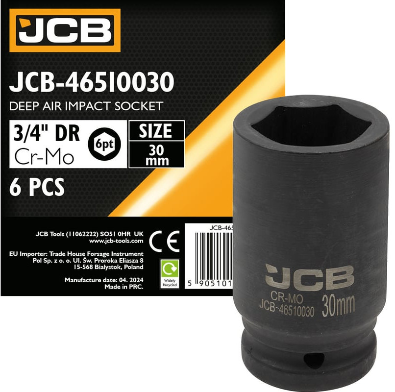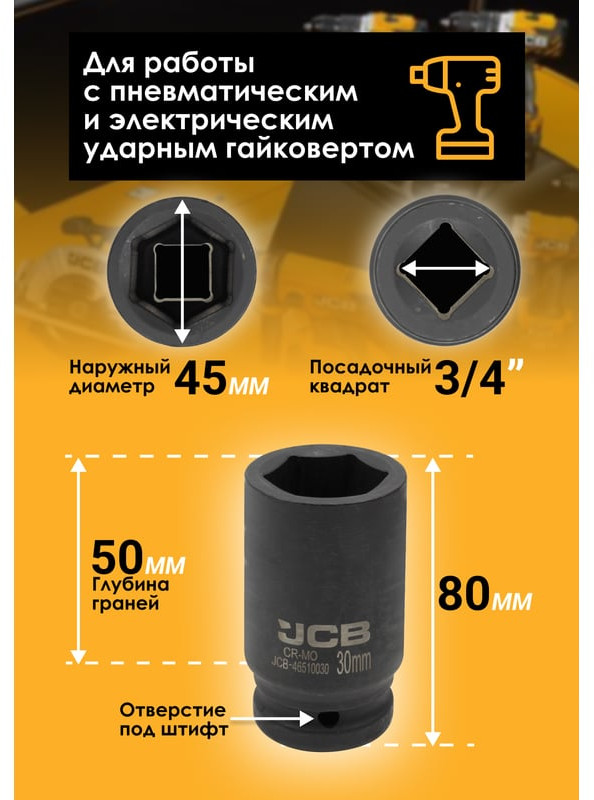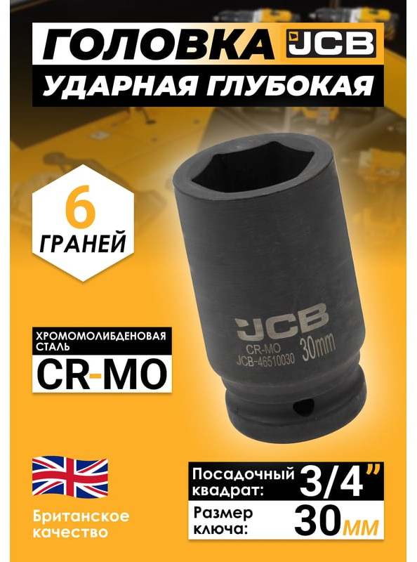 Головка ударная глубокая JCB — это незаменимый инструмент для профессиональных механиков и автолюбителей. Изготовлена из высококачественной хромомолибденовой стали, что придает ей прочность и стойкость к интенсивному использованию. Головка имеет удлиненную форму, что позволяет работать с крепежом, расположенным в углублениях или на длинных шпильках. 6-гранный профиль обеспечивает прочное сцепление с болтами и гайками. Головка снабжена посадочным квадратом 3/4″, что обеспечивает ее совместимость с различными ручными и пневматическими инструментами.