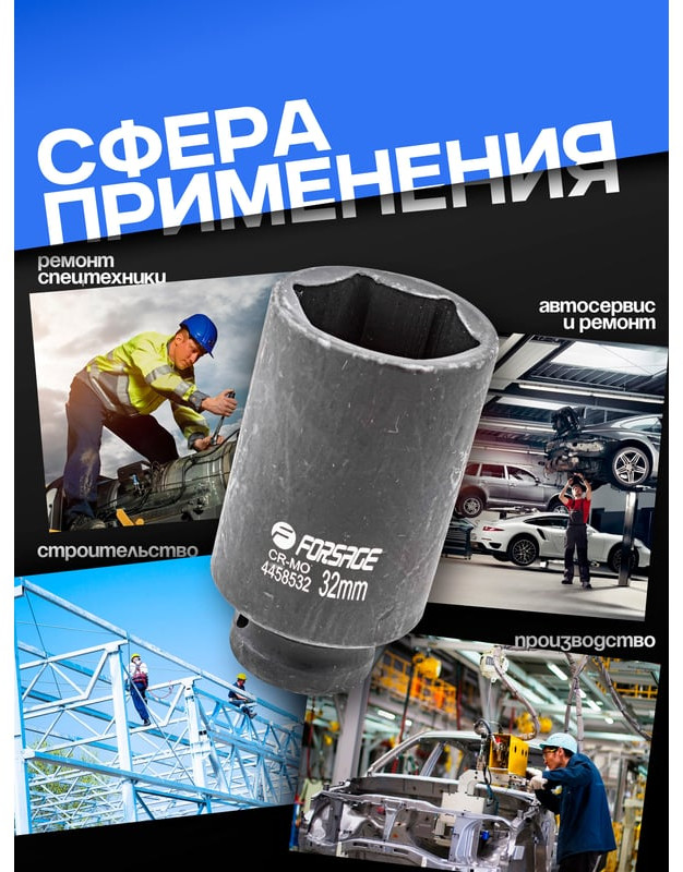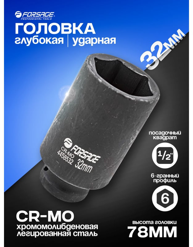 Головка ударная 32мм (6 граней),1/2″ — это незаменимый инструмент для профессиональных механиков и автолюбителей. Головка изготовлена из высококачественной хромомолибденовой стали, что придает ей прочность и стойкость к интенсивному использованию. Головка имеет 6-гранный профиль, который обеспечивает прочное сцепление с болтами и гайками. Головка имеет удлиненную форму, что позволяет работать с крепежом, расположенным в углублениях или на длинных шпильках. Головка снабжена 1/2" квадратным приводом, что обеспечивает ее совместимость с различными ручными и пневматическими инструментами.