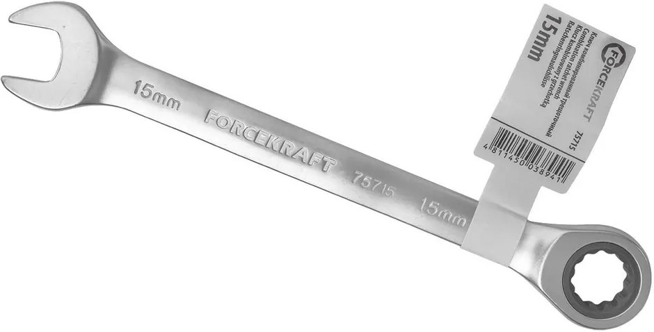 Ключ комбинированный трещоточный 15 мм — это удобный инструмент для работы с крепежными элементами, который сочетает в себе свойства рожкового и накидного ключей. Для работы в труднодоступных местах подойдет рожковый ключ. Накидной обладает большей эффективностью при отворачивании тугого крепежа. Трещоточный механизм в накидной части ключа, позволяет комфортно работать в местах с ограниченным пространством. Ключ изготовлен из высококачественной стали Cr-V.