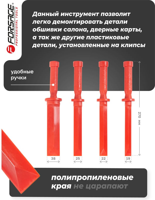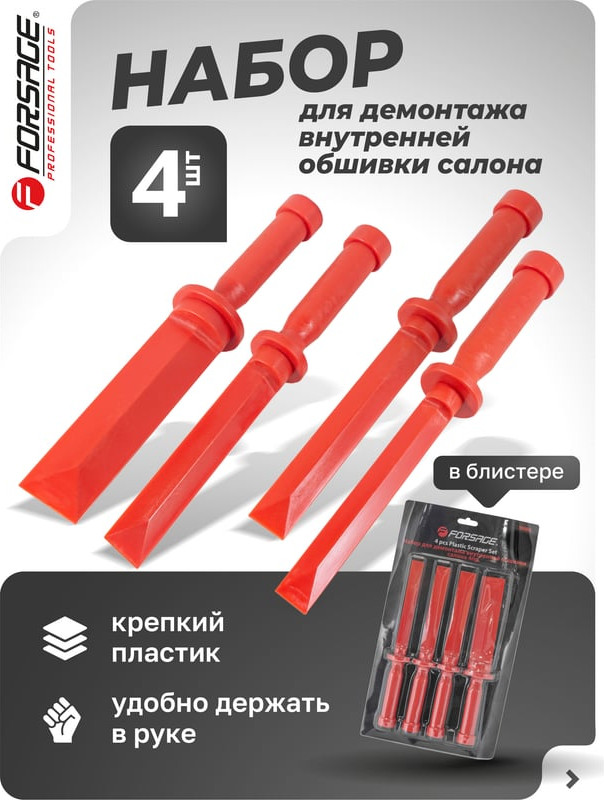 Forsage Набор приспособлений для демонтажа внутренней обшивки салонаВ данный момент этот товар отсутствует в продаже. Возможно, у нас найдется аналогичный или похожий товар здесь. Набор пластиковых скребков, 4 предмета в блистере. Применяется для удаления клеевых насадок и наклеек с кузова и стёкол также подходит для снятия отделки и значков. Полипропиленовые края не поцарапают панель и могут быть повторно заточены, когда это потребуется. Без специализированного инструмента здесь не обойтись. Поэтому и пригодится данный набор инструментов, который сделает эту работу эффективной. Инструменты выполнены из высококачественного прочного пластика, поэтому повреждения и царапины вашей машине не страшны. Длина скребков: 270 мм. Размер: 19 мм (3/4″), 22 мм (7/8″), 25 мм (1″), 38 мм (1-1/2″). |