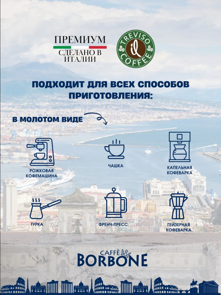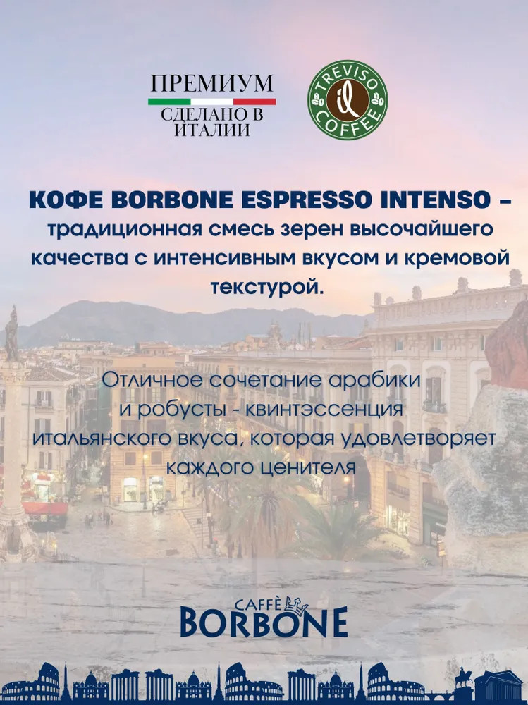 Любите начинать день крепким кофе с выраженной горчинкой? Тогда вам точно стоит попробовать неаполитанский купаж Borbone Espresso Intenso Ground. 20% арабики и 80% робусты позволит неспешно насладиться бодрящим эспрессо, не выходя из дома. Молотый кофе Borbone Espresso Intenso непременно порадует настоящих ценителей классического неаполитанского эспрессо. Зерна для купажа были выращены на престижных плантациях Южной Америки, Центральной Африки и Индии. Бобы прошли темную обжарку, которая придает вкусу кофе карамельно-шоколадные нотки, дымный аромат и образует нежную кремовую пенку. Приготовить купаж достаточно просто. Для этого используйте автоматическую кофемашину, итальянскую кофеварку или обычную турку. После приготовления налейте напиток в чашку и сделайте глоток. Сначала в аромате эспрессо будут преобладать нотки жареного миндаля и хлеба. И лишь в конце дегустации горечь робусты дополнится слегка сладковатыми, почти пряными оттенками.