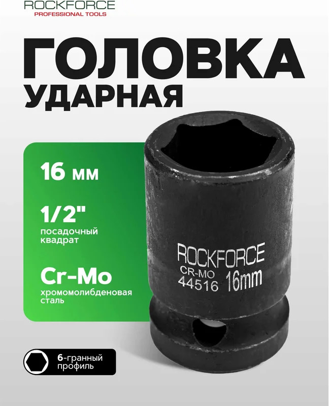 Головка торцевая ударная 6-гранная 16 мм 1/2″ представляет собой высококачественный инструмент, созданный для эффективной работы с болтами и гайками в условиях, требующих повышенного усилия. Головка имеет 6-граней и посадочный квадрат 1/2".
