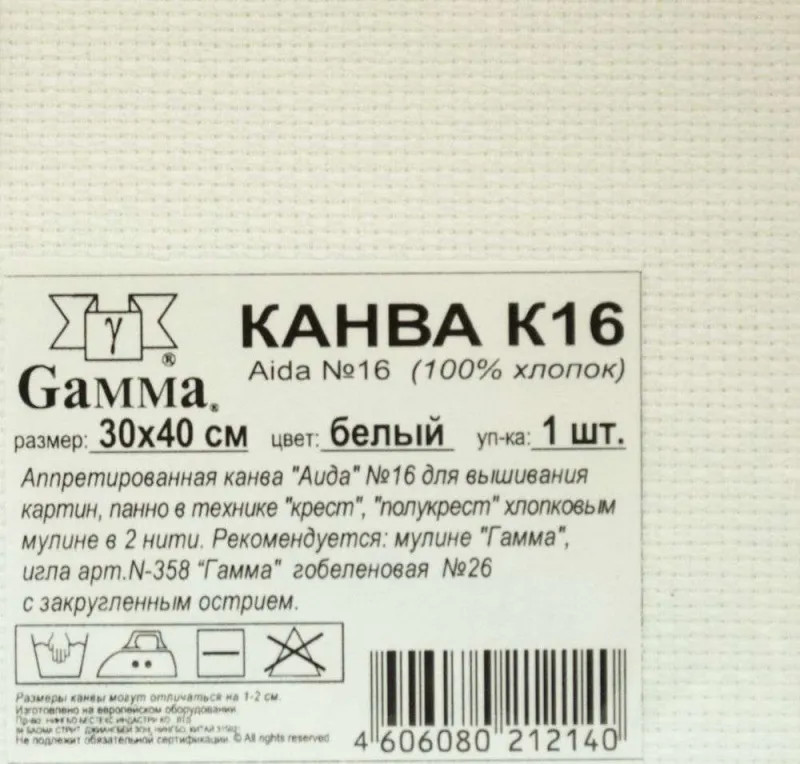 Gamma Канва «Aida № 16»В данный момент этот товар отсутствует в продаже. Возможно, у нас найдется аналогичный или похожий товар здесь. Канва Gamma Aida — хлопчатобумажная ткань для вышивания. Применяется для вышивания крестом, полукрестом хлопковым мулине в 2 нити, а также для вышивания гладью, гобеленовым швом, в ковровой технике. Канва Gamma Aida достаточно жёсткая (аппретированная) и плотная, позволяет вышивать без использования пялец. |