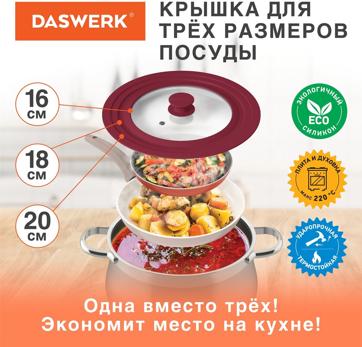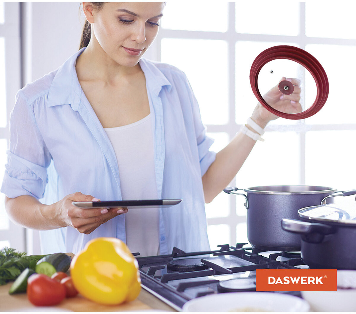 Универсальная крышка Daswerk, выполненная из силикона и стекла, позволит сэкономить не только время, но и пространство на кухне: одну крышку можно использовать для посуды разных размеров: 16 см, 18 см и 20 см в диаметре. Крышка Daswerk изготовлена из термостойкого стекла, что позволяет контролировать процесс приготовления без потери тепла. Ободок из экологичного жаропрочного силикона выдерживает температуру до 220°С.