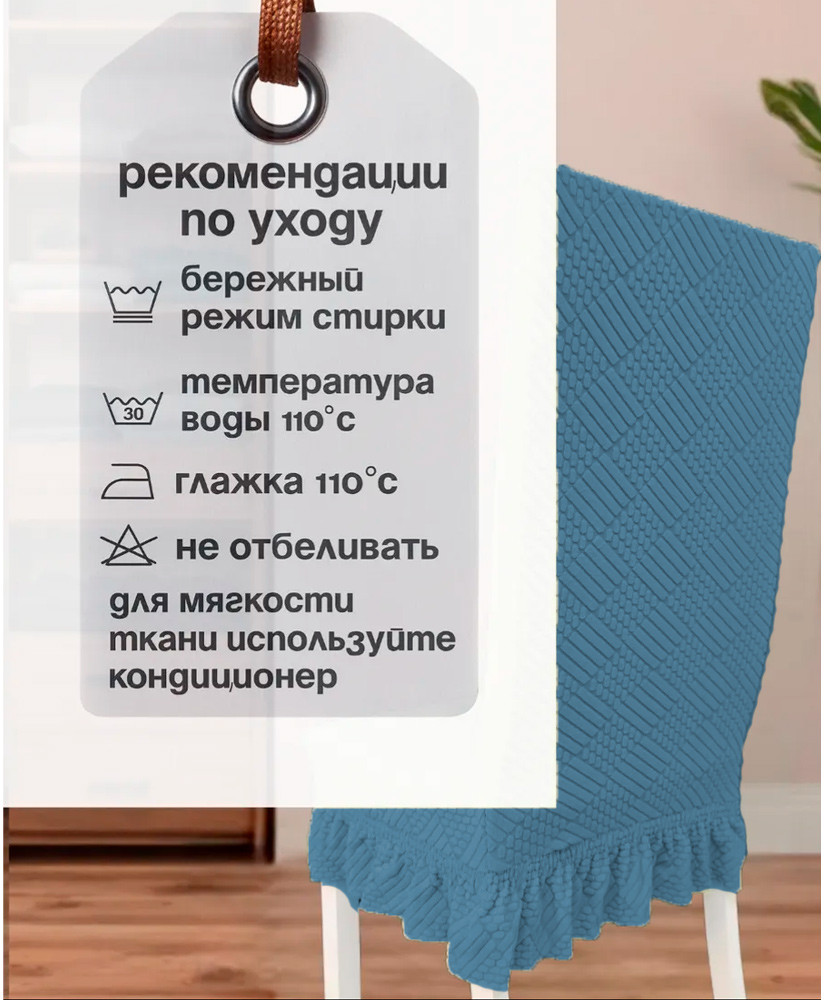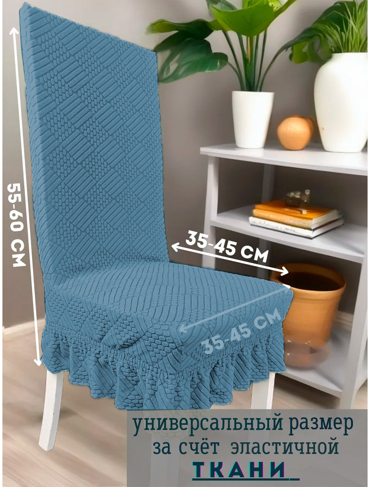Обратите внимание! Цвет, который передает дисплей вашего устройства может отличаться от натурального цвета чехла.ента, так и эстетично скроют недостатки нижней части стульев. Чехлы универсальны, поэтому подойдут на любую конструкцию стула, а излишки ткани легко убираются в расстояние между спинкой и сиденьем, что также дополнительно зафиксирует чехол на стуле. Чехол защитит ваш стул от ежедневных воздействий и облагородит его внешний вид.