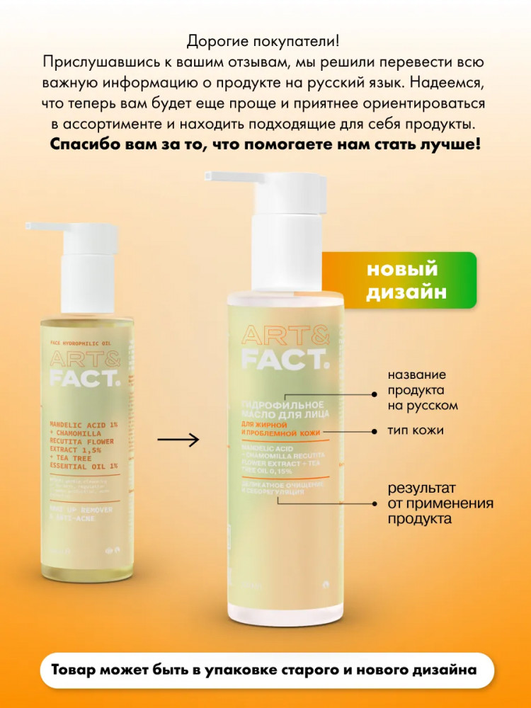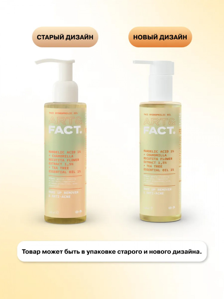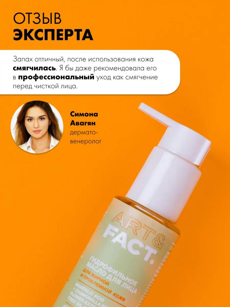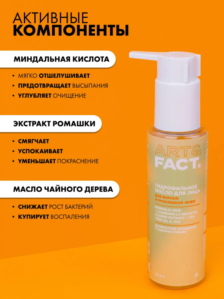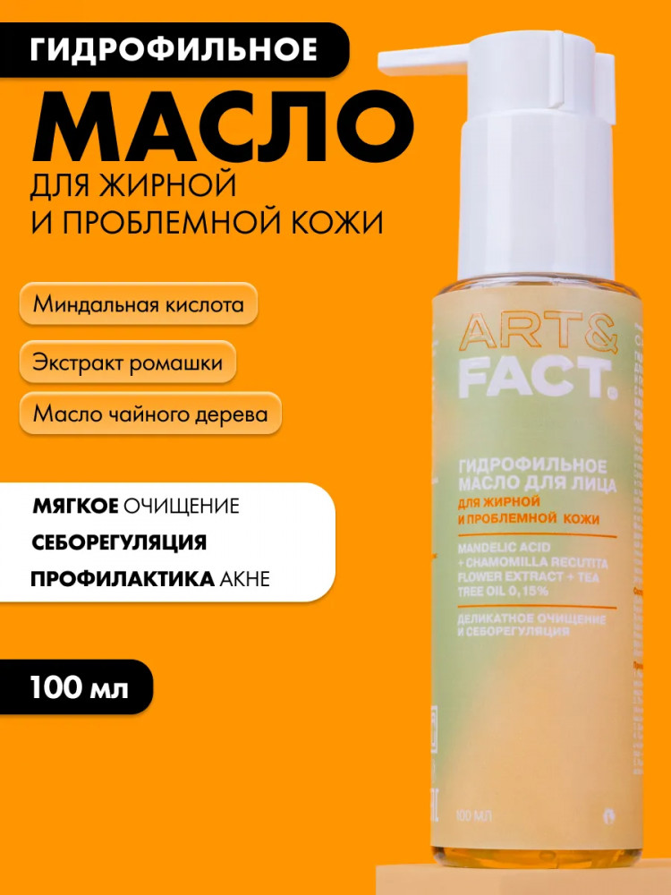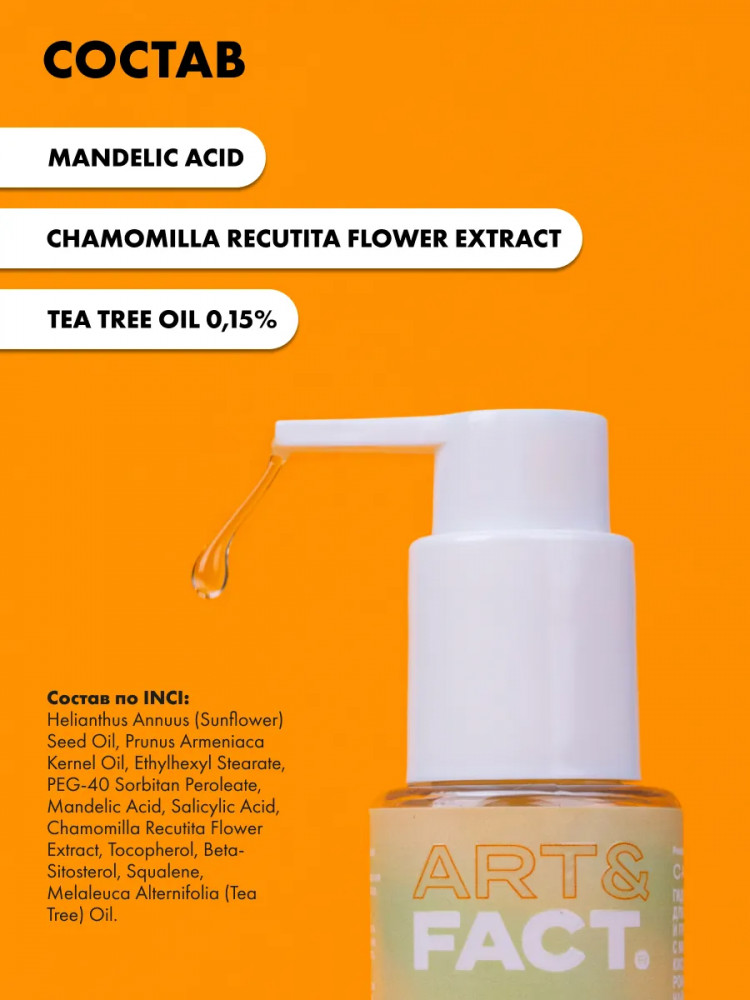 Art&Fact Гидрофильное масло для жирной и проблемной кожи с миндальной кислотой, экстрактом ромашки и маслом чайного дерева 0,15% «Mandelic Acid + Chamomilla Recutita Flower Extract + Tea Tree Oil 0,15%»