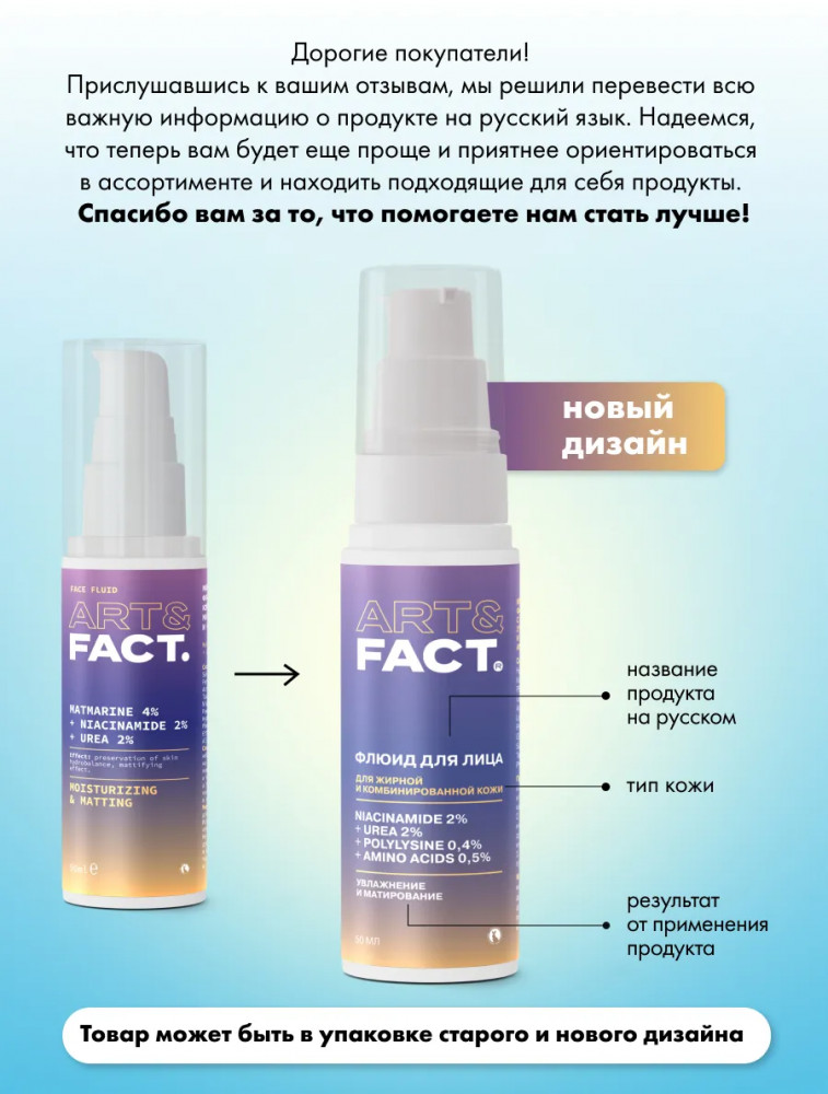 Art&Fact Флюид для жирной кожи лица матирующий и увлажняющий с ниацинамидом 2%, мочевиной 2%, полилизином 0.4% и комплексом аминокислот 0.5%