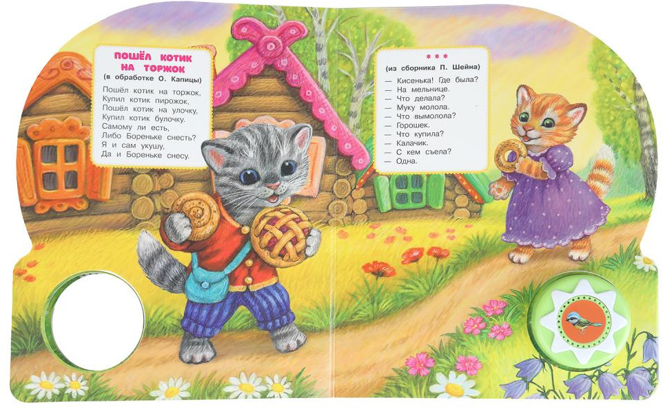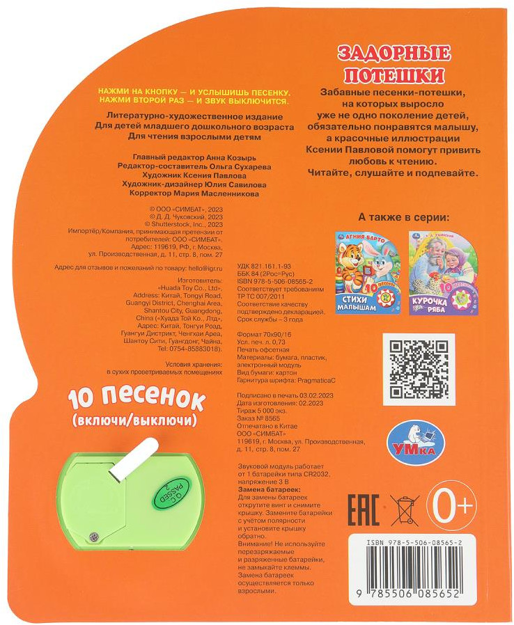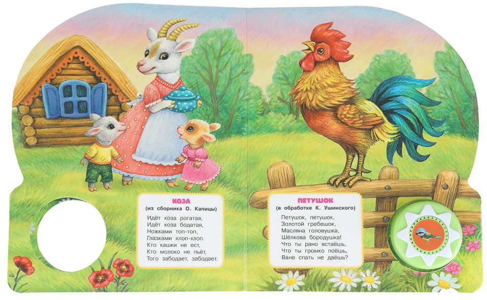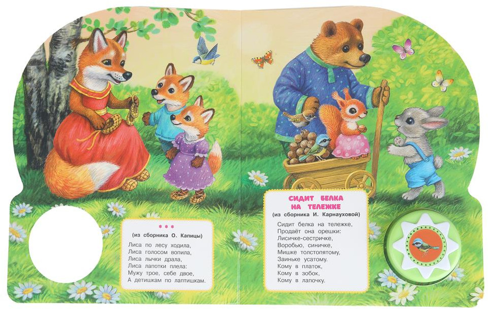 УМка Книга музыкальная «Задорные потешки»В данный момент этот товар отсутствует в продаже. Возможно, у нас найдется аналогичный или похожий товар здесь. Музыкальная книга «Задорные потешки» ТМ «УМка» — отличный подарок для детей. Ребёнок с удовольствием будет листать плотные картонные страницы, рассматривать красочные картинки, нажимать на кнопку и слушать задорные потешки. Малыш легко освоит включение звука: при нажатии на кнопку включится первая песенка, при втором нажатии выключится, в 3-ий раз — заиграет следующая и т.д. Благодаря компактному формату книгу удобно взять с собой в дорогу. Чтение музыкальной книги ТМ «УМка» и игра с ней развивают: слуховое восприятие, мелкую моторику, фантазию, образное мышление и память. |