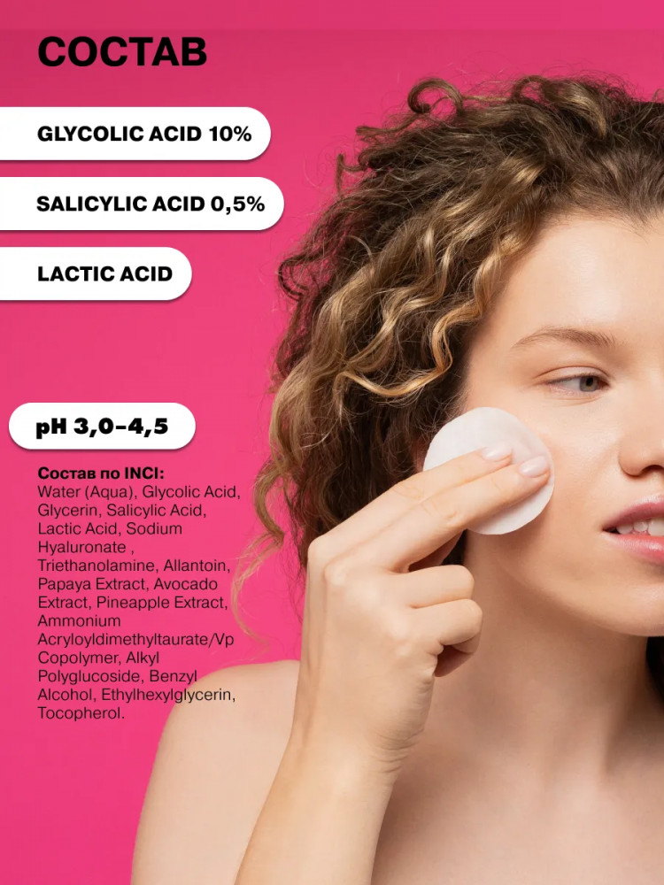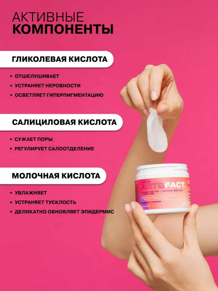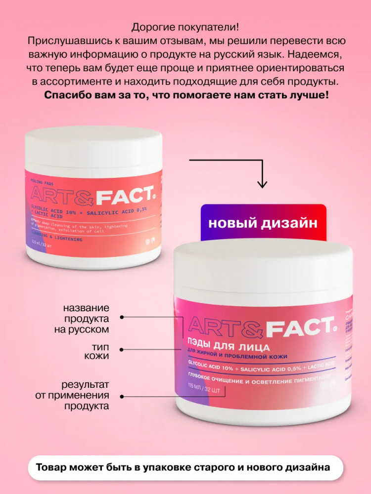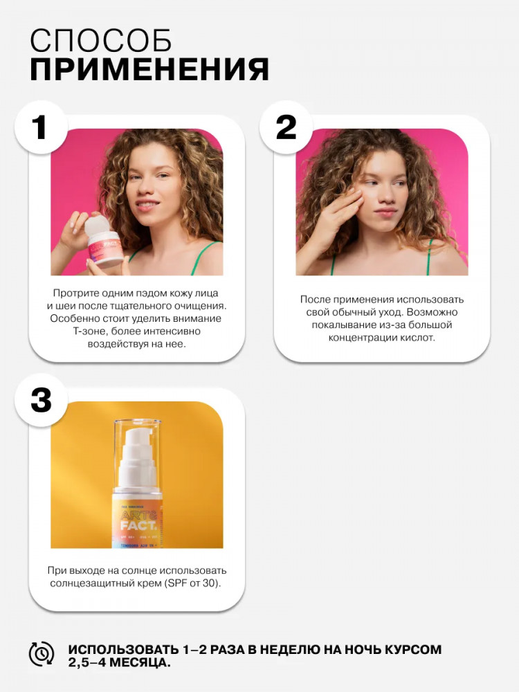 Art&Fact Пилинг-пэды для лица очищающие кислотные с гликолевой кислотой 10%, салициловой и молочной кислотами «Glycolic Acid 10%, Salicylic Acid 0.5%. Lactic Acid»
