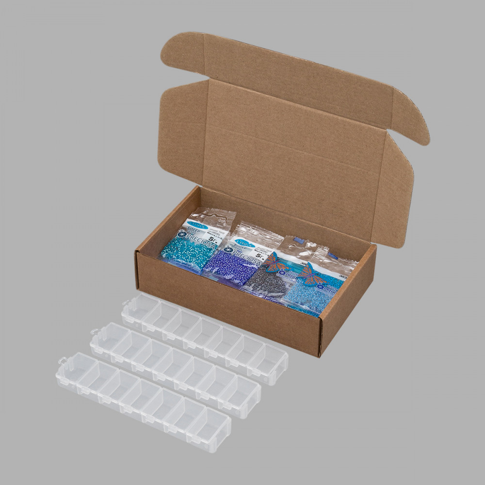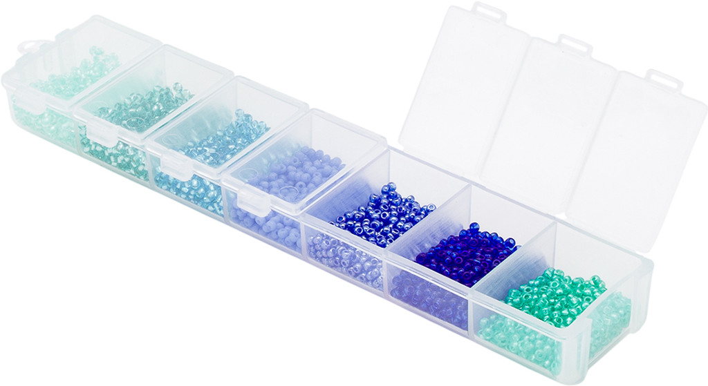 В наборе 21 цвет. Бисер набор расфасован в пакетики по 5 г. К набору прилагаются пластиковые контейнеры с 7 ячейками, каждая ячейка имеет отдельную крышечку, которая легко открывается.