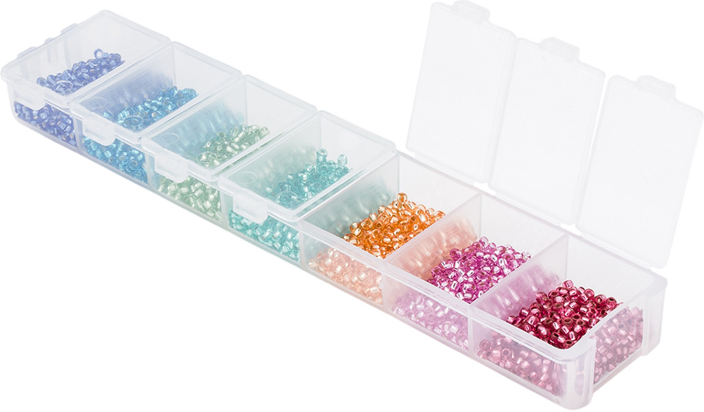 В наборе 21 цвет. Бисер набор расфасован в пакетики по 5 г. К набору прилагаются пластиковые контейнеры с 7 ячейками, каждая ячейка имеет отдельную крышечку, которая легко открывается.