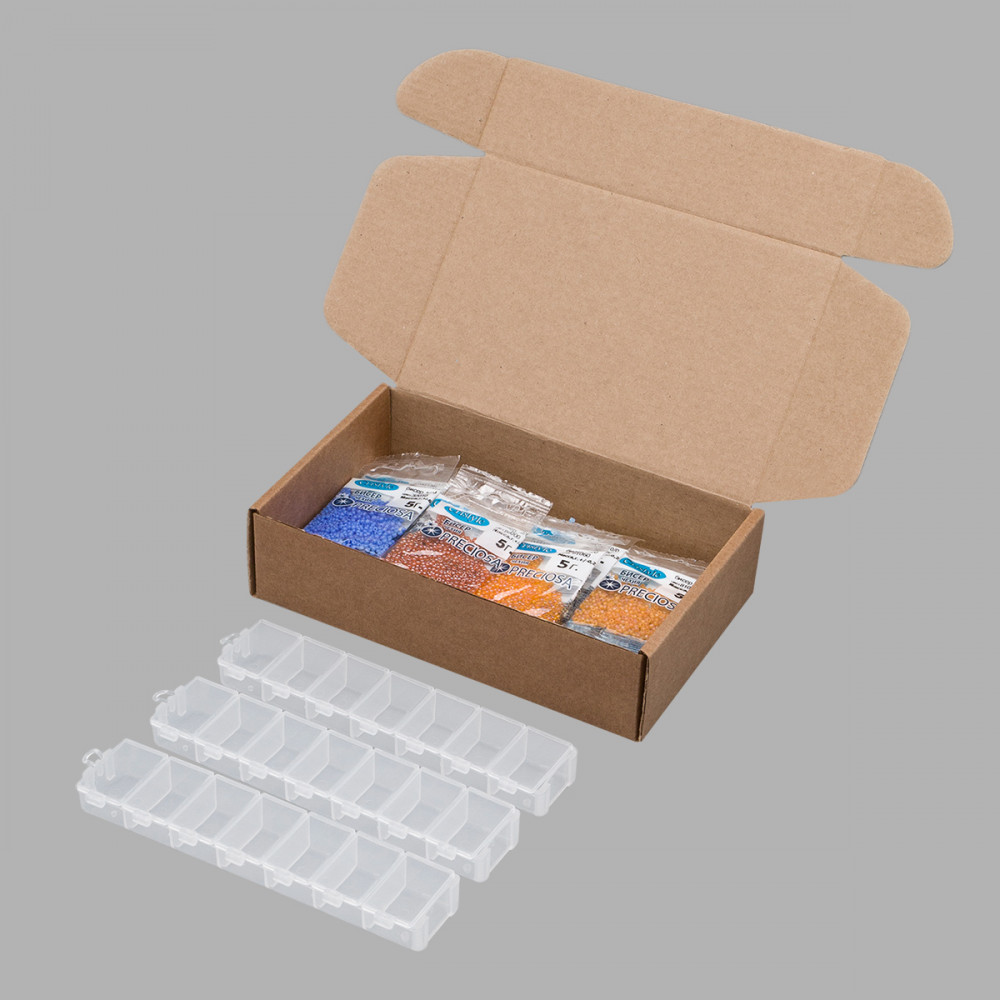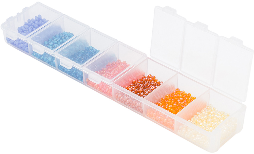 В наборе 21 цвет. Бисер набор расфасован в пакетики по 5 г. К набору прилагаются пластиковые контейнеры с 7 ячейками, каждая ячейка имеет отдельную крышечку, которая легко открывается.