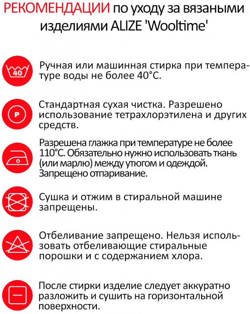 При вязании из Alize Wooltime следует учитывать ее толщину и подбирать узоры, которые наилучшим образом раскроют текстуру пряжи. Она отлично подойдет для создания рельефных узоров, кос и аранов, которые будут эффектно смотреться на теплых свитерах, кардиганах и шапках. Также она прекрасно подходит для жаккардовых узоров, благодаря чему можно создавать яркие и оригинальные вещи. Alize Wooltime — это выбор тех, кто ценит комфорт, тепло и долговечность в вязаных изделиях. Она позволяет создавать вещи, которые будут радовать вас и ваших близких не один сезон. Богатая палитра цветов позволит воплотить в жизнь самые смелые творческие задумки, а простота в уходе и практичность делают ее идеальным материалом для создания любимых вещей на каждый день. Рекомендуемые спицы: № 4-5, крючок: № 3,5-4.