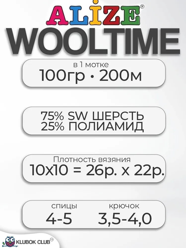Пряжа Wooltime от Alize представляет собой отличный вариант для создания носков, чулок, гетр, а также варежек и перчаток. Пряжа на 75% состоит из шерсти, которая придает ей гладкость, упругость и легкий блеск. Шерсть приятно ощущается на коже, устойчива к износу и не образует катышков. Добавление полиамида значительно увеличивает прочность изделий из этой пряжи. Alize Wooltime обладает высокой теплотой благодаря большому содержанию шерсти, благодаря чему изделия из нее эффективно удерживают тепло. Мягкая текстура пряжи делает ее приятной на ощупь. С учетом всех своих свойств, нитка идеально подходит как для взрослых, так и для детей. Если вы уже имели удовольствие вязать из Superwash Alize, то можете обратить внимание, что эта пряжа просто в два раза толще.
