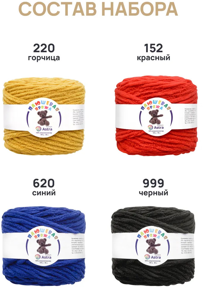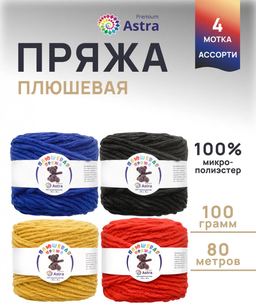 В наборе ассорти представлены 4 оттенка. Плюшевая пряжа производится на современном оборудовании итальянской марки GAUDINO, известной своими высокими стандартами качества.