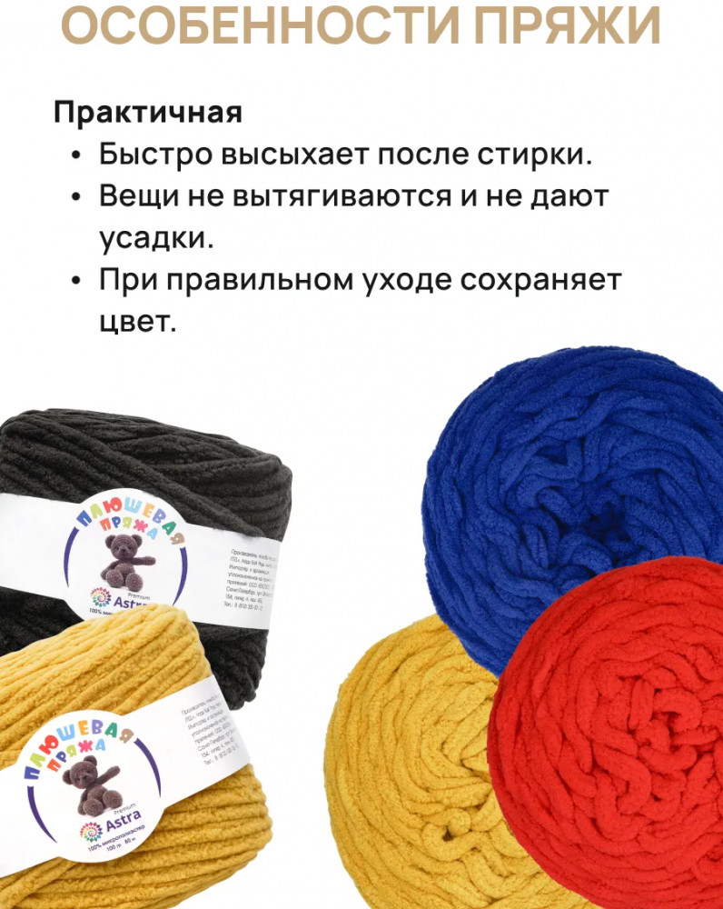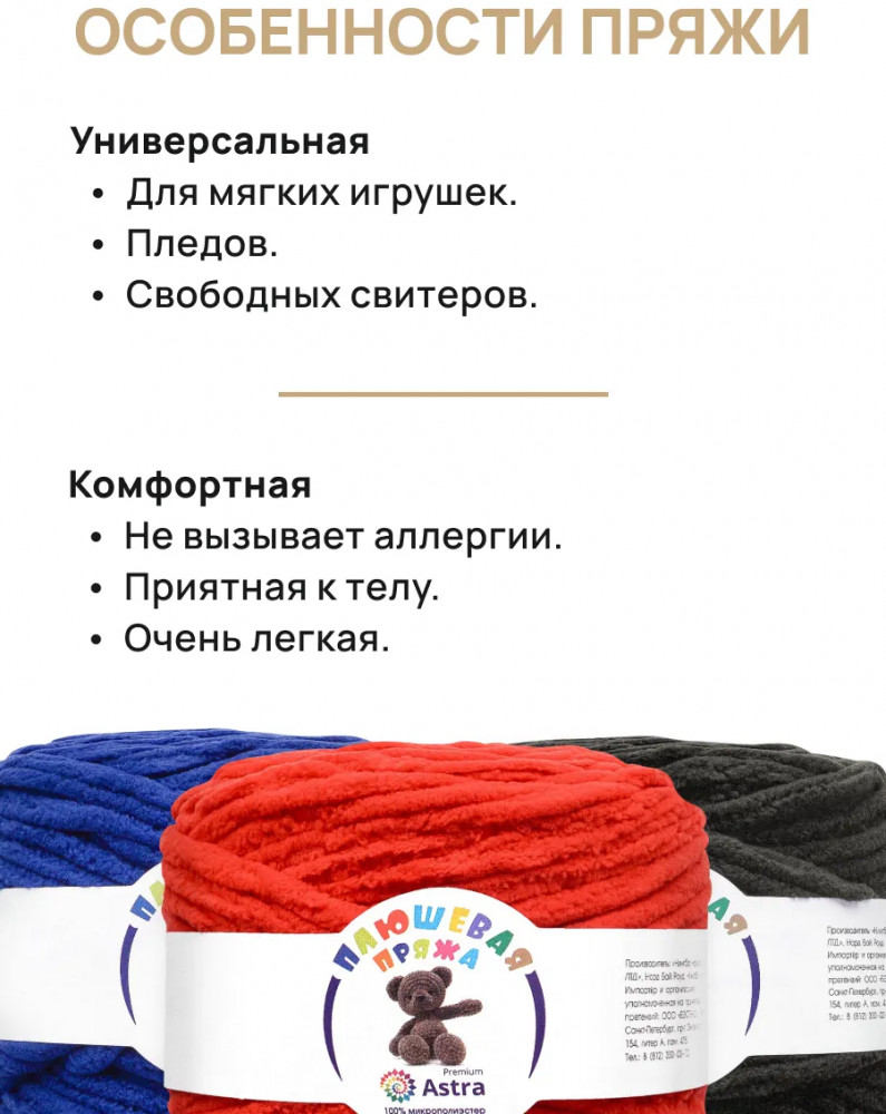 Пряжа Плюшевая от Astra Premium — это пряжа нежной текстуры с тончайшим пушистым ворсом, который придает изделиям объем, мягкость и ощущение комфорта. Нить плюшевой пряжи изготавливается из 100% микрополиэстера — материала, который не раздражает кожу и обладает рядом преимуществ. Микрополиэстер известен своей прочностью, устойчивостью к деформации и выцветанию. Благодаря этому изделия из Плюшевой пряжи сохраняют свою форму и яркость цвета на протяжении длительного времени, даже после многочисленных стирок. Из нее можно связать теплый и уютный свитер свободного кроя, который подарит комфорт в холодную погоду. Также она отлично подойдет для создания мягких игрушек. И, конечно же, Плюшевая пряжа — идеальный выбор для вязания пледов, которые создадут в вашем доме атмосферу тепла и уюта.