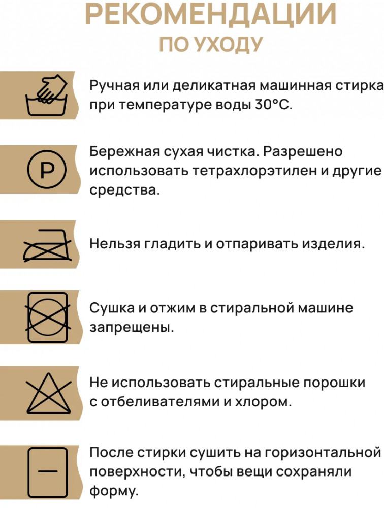 Рекомендации по уходу за изделиями: деликатная стирка при температуре 30 градусов без отбеливающих средств, не гладить, только естественная сушка, возможна профессиональная чистка.