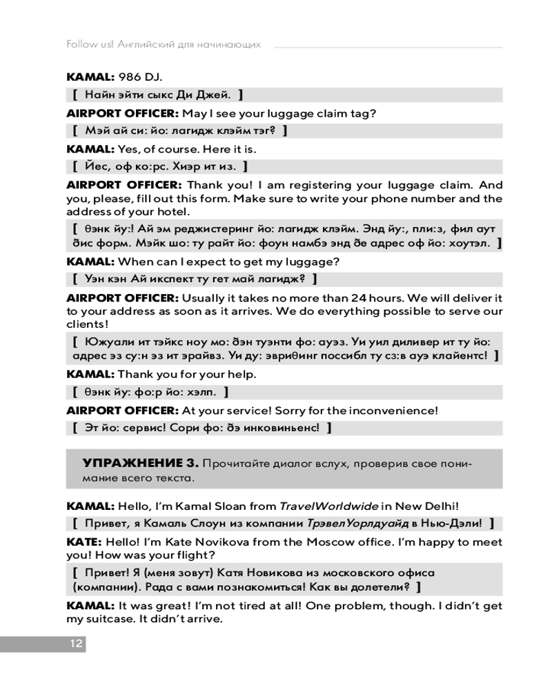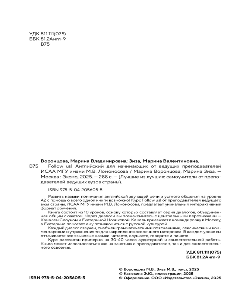 Серия: Лучшие из лучших: самоучители от преподавателей ведущих ВУЗов страны Сформировать, развить и улучшить навыки понимания английской звучащей речи и устного общения на уровне А2 поможет курс «Follow us» от преподавателей ведущего вуза страны — ИСАА МГУ. Книга состоит из 10 уроков, основу которых составляет серия аутентичных диалогов, связанных единым сюжетом: Камаль Слоун прибывает в Москву с деловой поездкой, его встречает и сопровождает Екатерина Новикова, помогая познакомиться с русской культурой. Все диалоги представлены в текстовом и аудиоформате, доступном по QR-кодам прямо из книги. Каждый диалог имеет грамматические пояснения, а также лексический комментарий с упражнениями для закрепления пройденного. Курс рассчитан примерно на 30–40 часов аудиторной и самостоятельной работы. Книга может использоваться как на занятиях с преподавателем, так и для самостоятельного освоения. |
