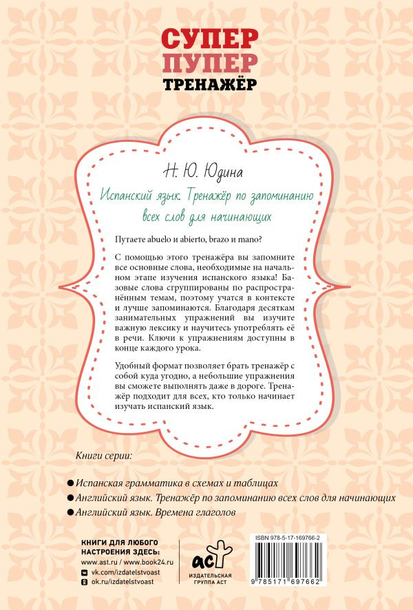 Испанский язык. Тренажёр по запоминанию всех слов для начинающихВ данный момент этот товар отсутствует в продаже. Возможно, у нас найдется аналогичный или похожий товар здесь. Серия: Суперпупертренажер Путаете abuelo и abierto, brazo и mano? С помощью этого тренажера вы запомните все основные слова, необходимые на начальном этапе изучения испанского языка! Базовые слова сгруппированы по распространенным темам, поэтому учатся в контексте и лучше запоминаются. Благодаря десяткам занимательных упражнений вы изучите важную лексику и научитесь употреблять ее в речи. Ключи к упражнениям доступны в конце каждого урока. Удобный формат позволяет брать тренажер с собой куда угодно, а небольшие упражнения вы сможете выполнять даже в дороге. Тренажер подходит для всех, кто только начинает изучать испанский язык. |