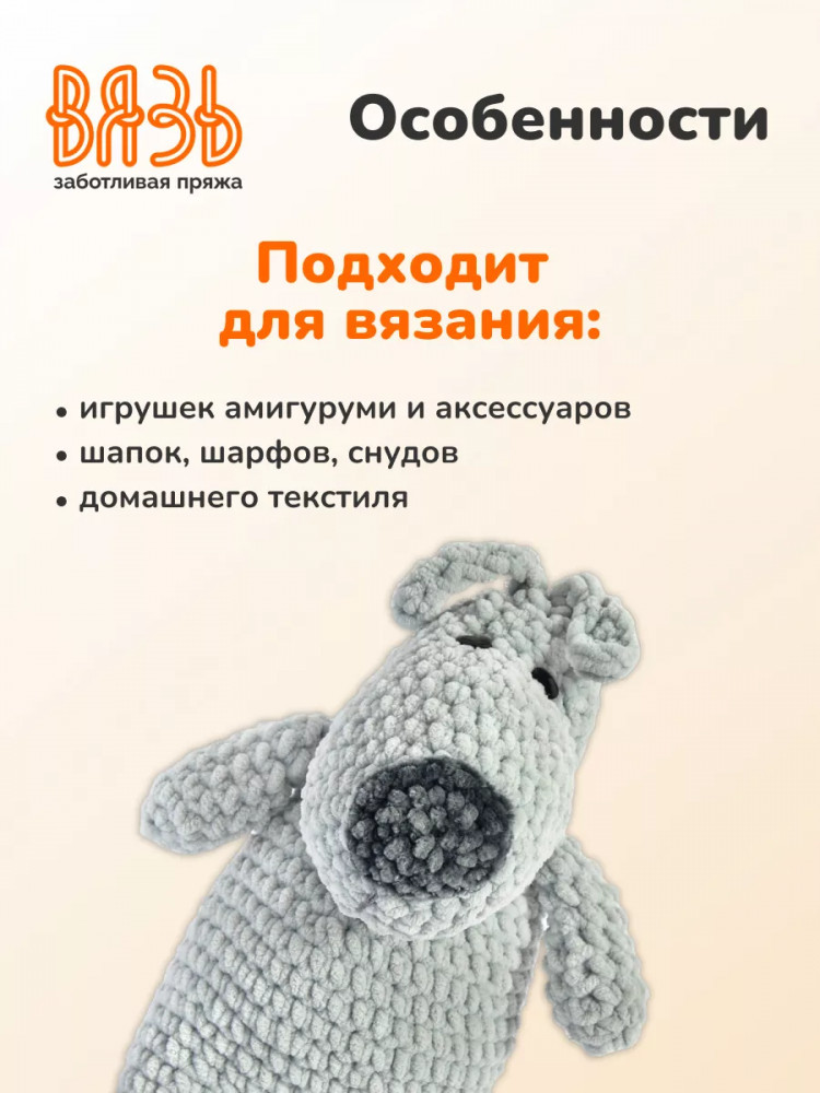 Велюровая пряжа — практичный выбор. Она изготовлена из 100% полиэстера: волокно очень легкое, отталкивает грязь и не привлекает моль. Ворс остается гладким и не скатывается. Из Велюровой пряжи получаются замечательные мягкие игрушки, с которыми приятно играть и обниматься, а также уютные покрывала и воздушные накидки.