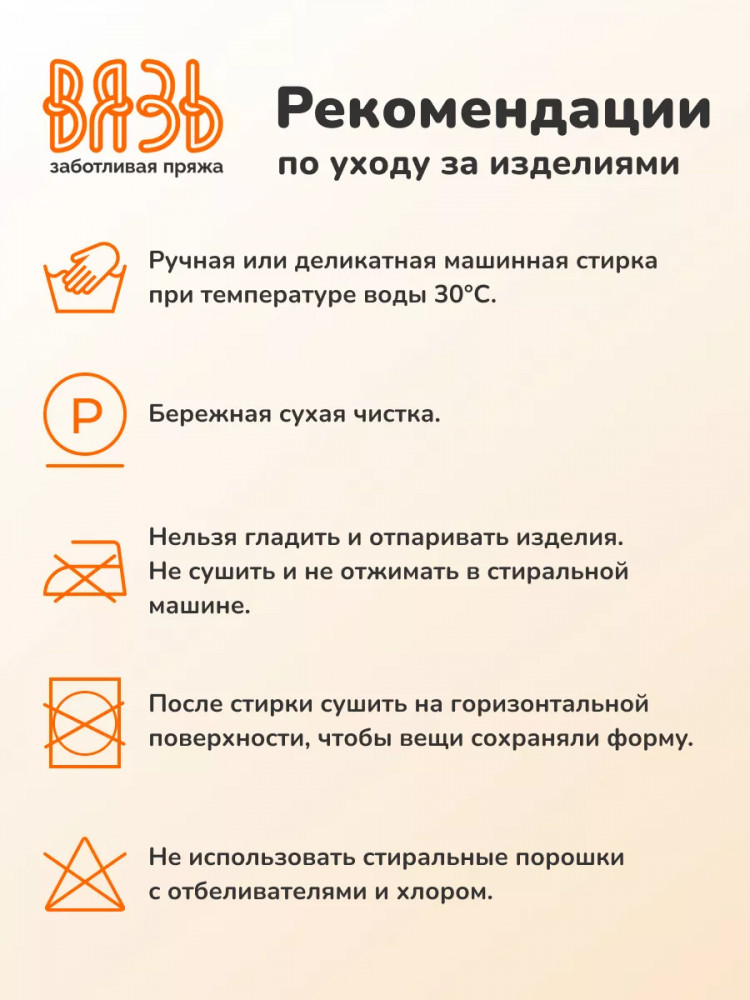 Советы по уходу: ручная стирка при температуре воды не выше 30 градусов. Не используйте отбеливатели и средства с хлором. Бережно отжимайте изделие и не выкручивайте: так нить сохранит свою структуру. Гладить запрещено. Допускается чистка щадящими средствами.