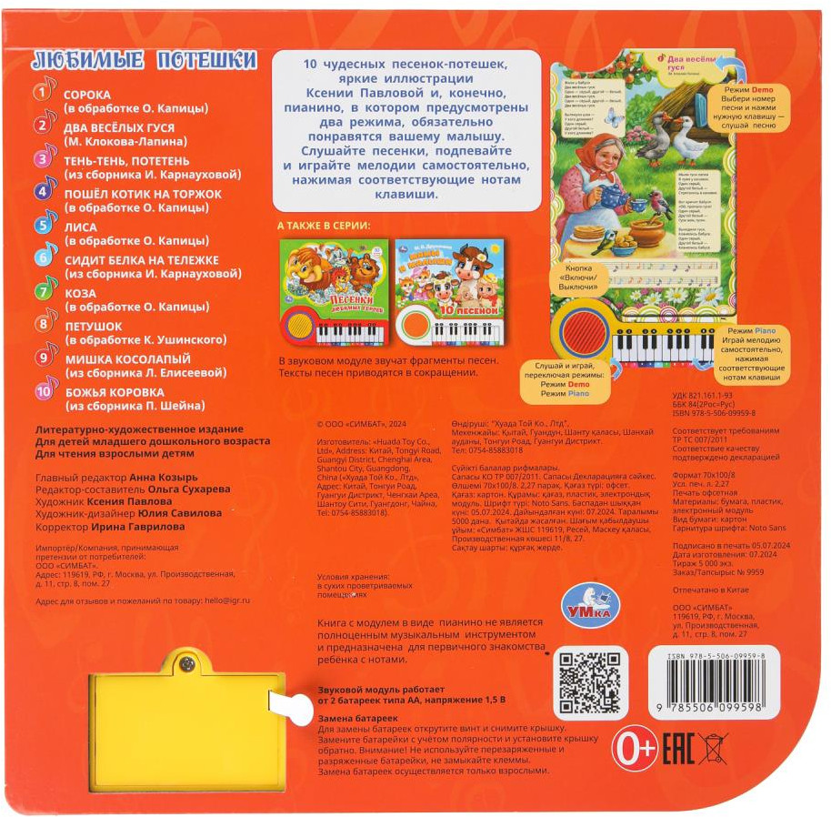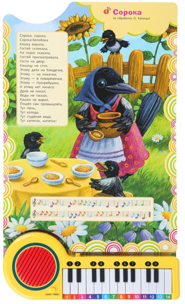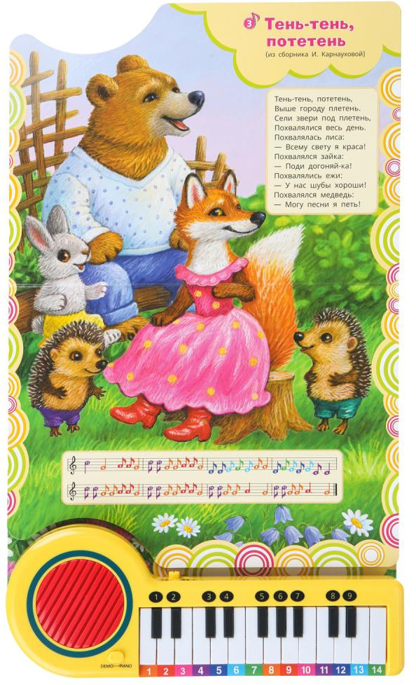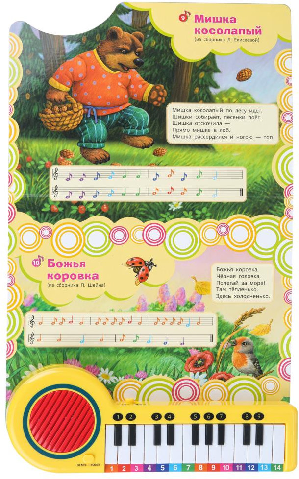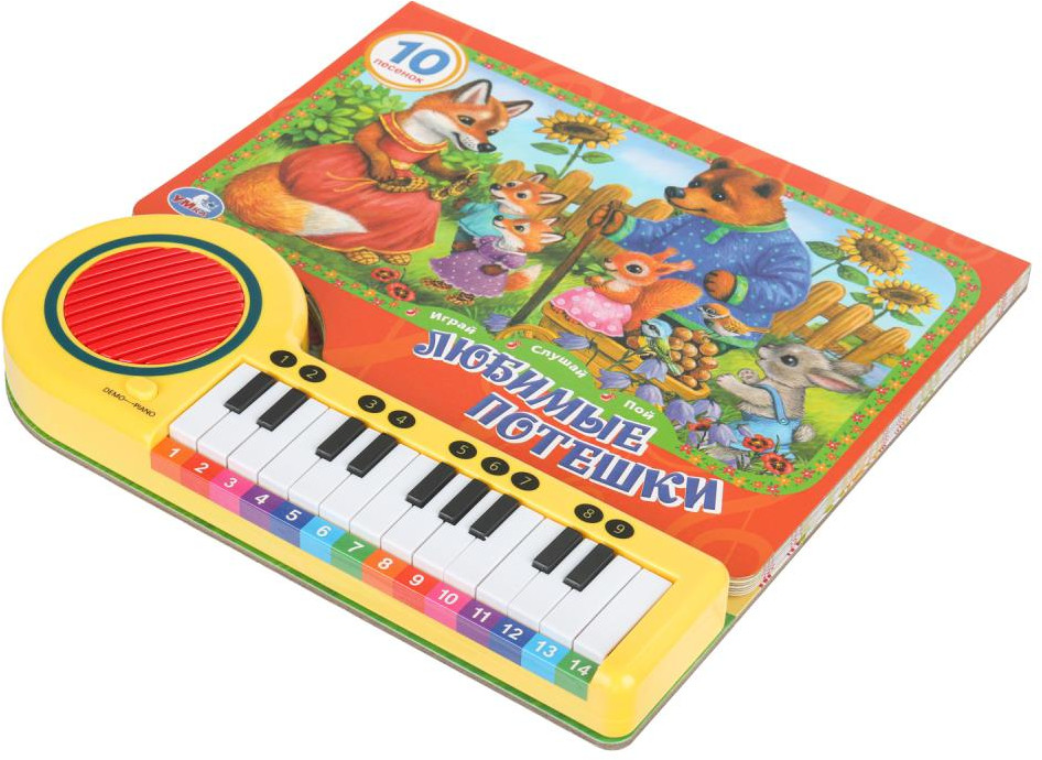 Книга-пианино «Любимые потешки» ТМ «УМка» станет прекрасным подарком для малыша. На каждой страничке это занимательной книги ребёнка ждут яркие иллюстрации, задорные потешки и ноты к песенкам. При нажатии на кнопку слева от клавиш происходит переключение на режим проигрывания песен, при втором нажатии — переключение на пианино. В режиме пианино маленький музыкант, нажимая на клавиши, сможет наиграть по нотам-подсказкам песенки из книги или придумать свои собственные мелодии. Книга сделана из плотного картона, поэтому мамы могут не опасаться, что ребёнок порвёт странички. Игра с книгой-пианино ТМ «УМка» развивает: слуховое восприятие, музыкальный слух, фантазию, образное мышление, внимание и память. |
