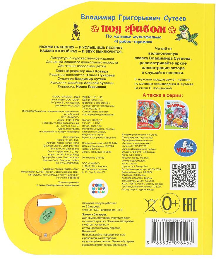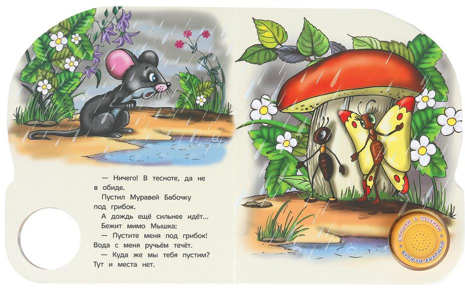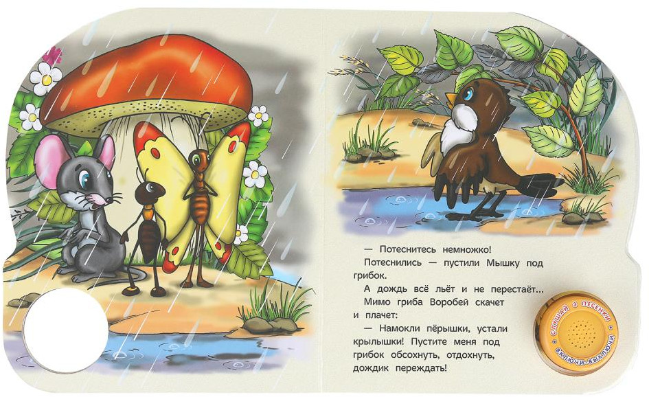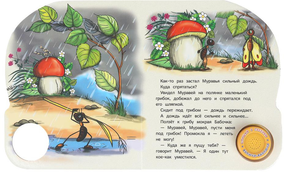 Музыкальная книга «В. Сутеев. Под грибом» ТМ «УМка» станет прекрасным подарком для малыша. Ребёнок с удовольствием будет листать плотные страницы, рассматривать красочные картинки, вместе с родителями читать известную сказку и, конечно, нажимать на кнопку и слушать мелодичные песенки. Малыш легко освоит включение звука: по нажатию на кнопку песенка включится, при втором нажатии выключится, при третьем — заиграет следующая композиция. Благодаря компактному размеру книгу удобно взять с собой в дорогу. Чтение музыкальной книги ТМ «УМка» и игра с ней развивают: музыкальный слух, фантазию, образное мышление, внимание и память. |