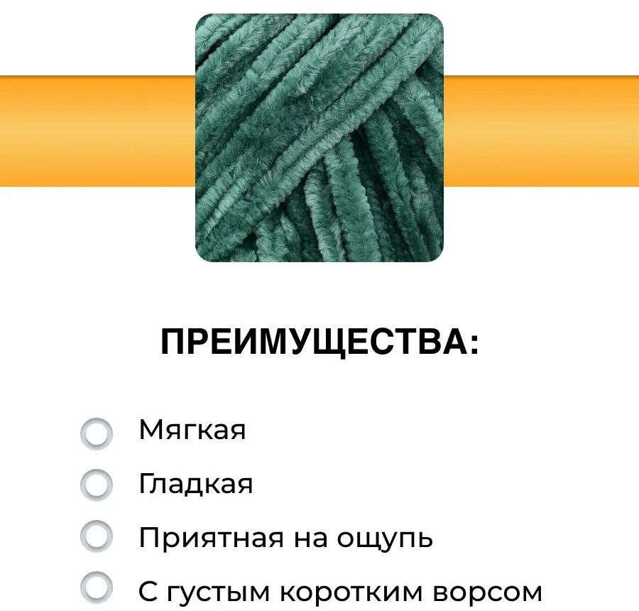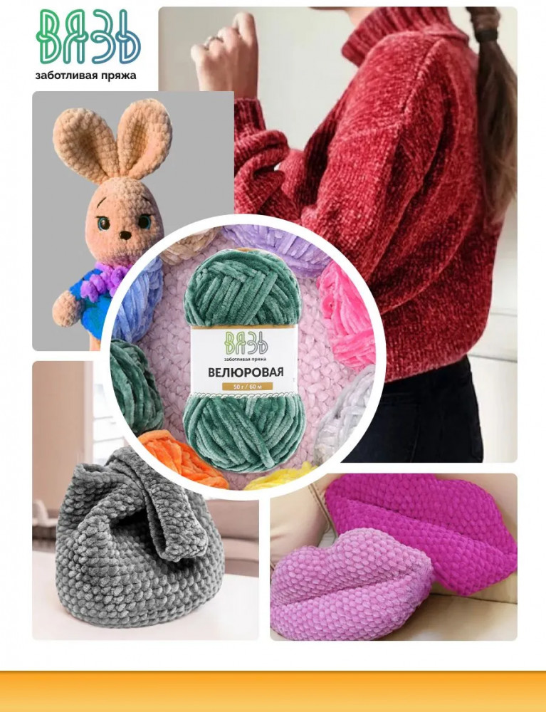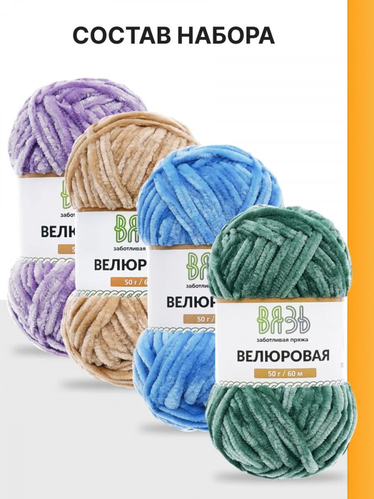 Набор велюровой пряжи от бренда Вязь — выбор для тех, кто ценит практичность, комфорт и ищет материал для новых проектов. Пряжа неслучайно называется велюровой: по всей длине она покрыта тончайшим ворсом. Ворс короткий и густой, но при этом очень упругий и гладкий. Нежные ворсинки приятны для любой кожи, даже самой чувствительной. Кроме того, они создают воздушную прослойку, которая задерживает тепло и создает ощущение уюта.