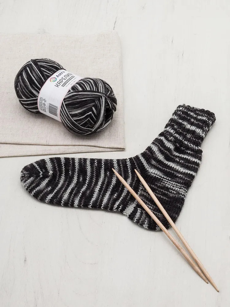 пряжа шерстистая. Носочки получились тонкие и тёплые. Можно носить в сапоги.