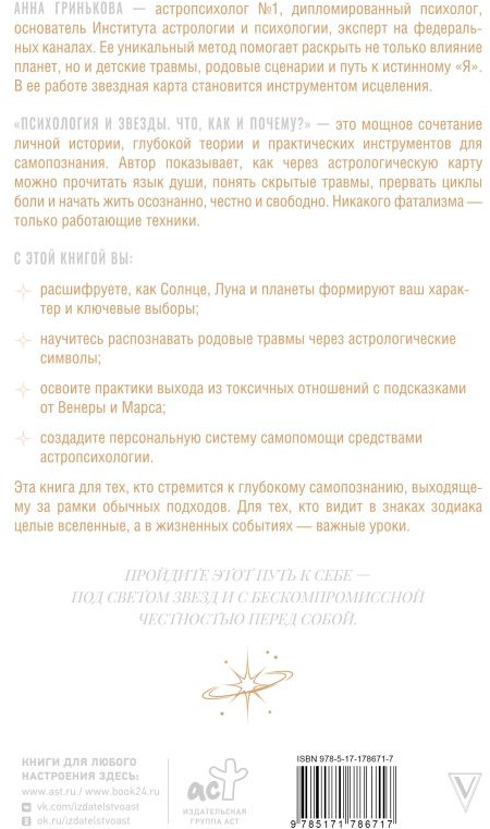 Анна Гринькова — астропсихолог № 1, дипломированный психолог, основатель Института астрологии и психологии, эксперт на федеральных каналах. Ее уникальный метод помогает раскрыть не только влияние планет, но и детские травмы, родовые сценарии и путь к истинному «Я». В ее работе звездная карта становится инструментом исцеления. «Психология и звезды. Что, как и почему?» — это мощное сочетание личной истории, глубокой теории и практических инструментов для самопознания. Автор показывает, как через астрологическую карту можно прочитать язык души, понять скрытые травмы, прервать циклы боли и начать жить осознанно, честно и свободно. Никакого фатализма — только работающие техники.