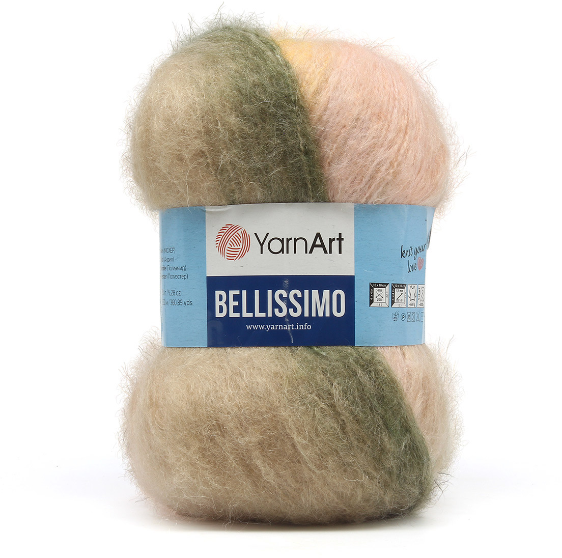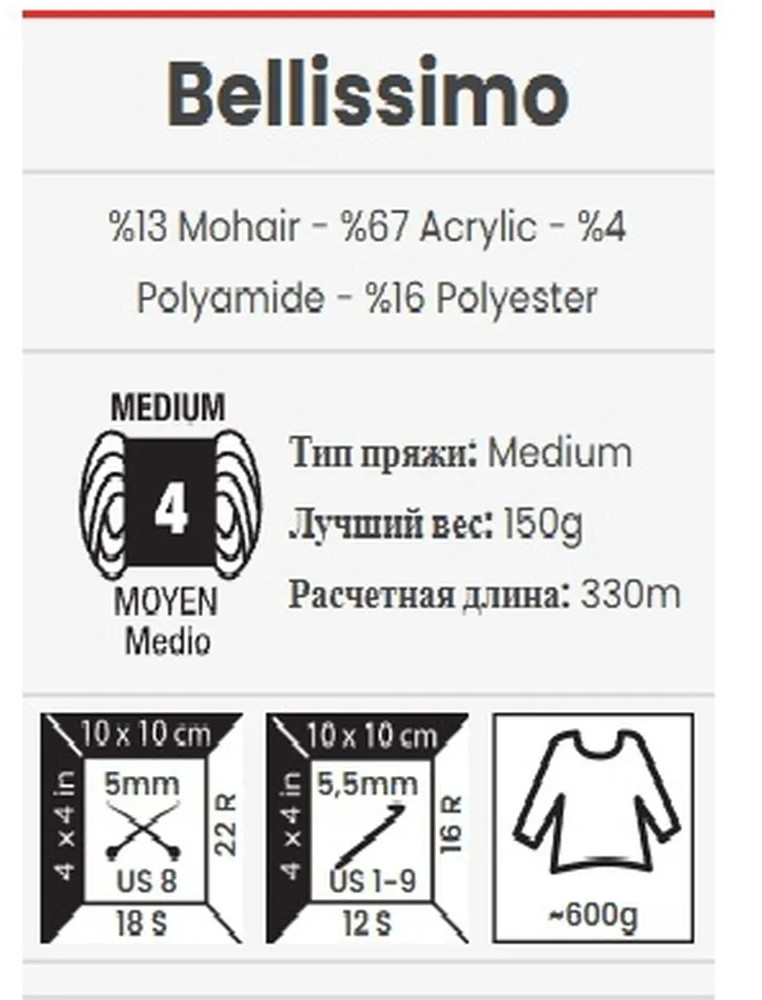 Bellissimo от YarnArt — пряжа, которая восхищает своей практичностью, мягкостью и элегантными расцветками. В составе пряжи натуральный мохер — он придает нити выраженный ворс и приятный согревающий эффект. Благодаря акриловому и полиамидному волокнам изделия из этой невесомой пряжи практичны в уходе и сохраняют форму после стирки. Нить окрашена длинными секциями — это позволяет создавать аккуратный контрастный узор. Ввязывать нить и подбирать оттенки вручную при этом не нужно — достаточно владеть простой техникой «лицевая гладь». В ассортименте множество расцветок на любой вкус — ярких и нежных, сдержанных и броских.