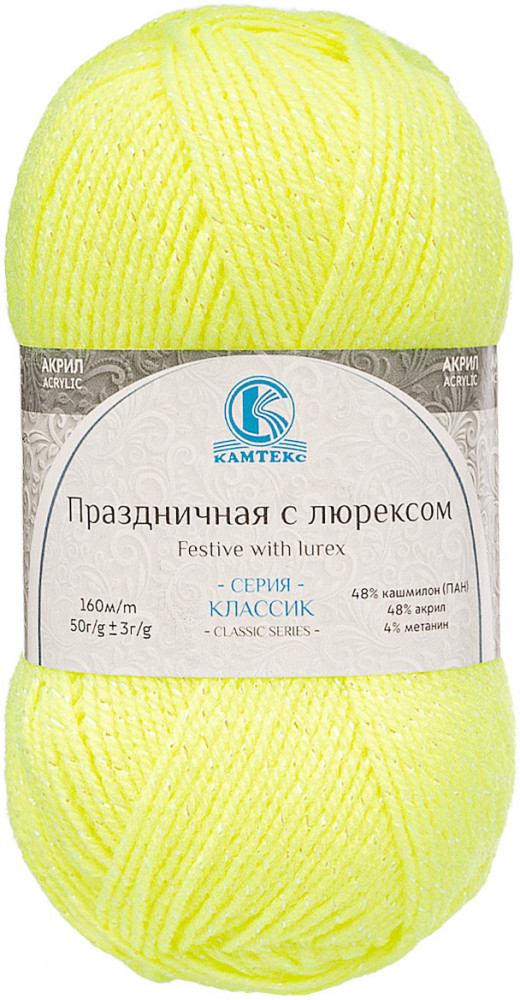 Праздничная с люрексом от Камтек’ идеально подходит для вечерних нарядов — кардиганов, платьев, шалей. Пряжа отличается обилием расцветок, на любой вкус — от яркой неоновой до сдержанной светло-бежевой. Смесь кашмилона я акрила оплетена люрексом, нить имеет легкий пушок и после влажной тепловой обработки не меняет свой вид. Подходит для новичков. Лицевая гладь получается ровно, полотно не косит. Кашмилон в составе пряжи исключает образование катышков, а метанитовые нити придают готовым изделиям праздничный блеск. Обратите внимание: люрексовая нить почти не колется, но вещи с таким материалом не стоит надевать на голое тело — они могут вызывать раздражение. Используйте подкладочную ткань или носите изделия из этой пряжи поверх другой одежды.