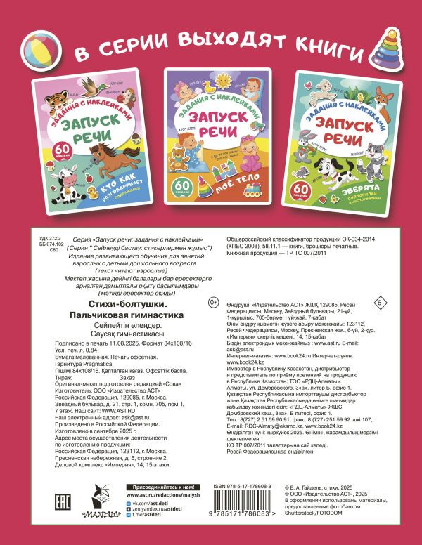 Серия: Запуск речи: задания с наклейками «Стихи-болтушки. Пальчиковая гимнастика» — замечательная книга для раннего речевого развития. Как помочь ребёнку начать произносить первые слова и разговориться? Предложите ему послушать весёлые потешки — для каждой строчки подобраны пальчиковые игры. Малыш будет с удовольствием повторять различные движения, которые видит на картинках, — так в игре активизируются речевые центры мозга, повышается эмоциональная устойчивость, развиваются слуховое восприятие, зрительно-моторная координация, внимание, память. |