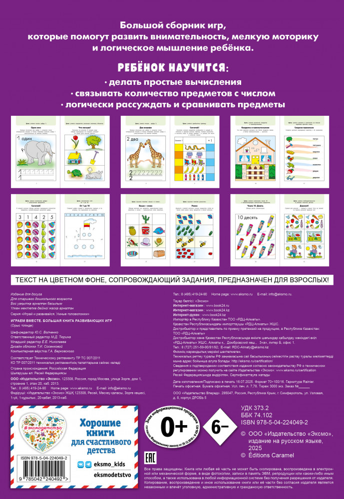 Серия: Играй и развивайся. Умные головоломки Проведите время с ребенком весело и познавательно! Перед вами — большой сборник развивающих игр для совместных занятий с ребенком возраста от 4 лет. Упражнения, включенные в сборник, направлены на развитие логического мышления, мелкой моторики и внимательности. Внутри вы найдете лабиринты, раскраски по номерам, игры на вычисление количества предметов и на понимание противоположных понятий, а также другие задания, которые малышу обязательно захочется пройти. Каждая игра сопровождается кратким описанием для родителей. Яркие цветные крупные иллюстрации, расположенные на каждой странице, привлекут внимание и заинтересуют ребенка. |