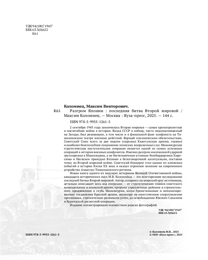 💳 Оплатить за товар можно при получении 🇰🇿 Есть бесплатная доставка по Казахстану от 1 дня 🎁 Копите бонусы с каждой покупки Серия: Главные сражения Великой Отечественной. Иллюстрированная энциклопедия 2 сентября 1945 года закончилась Вторая Мировая — самая кровопролитная и масштабная война в истории. Вклад СССР в победу, часто недооцениваемый на Западе, был решающим, в том числе и в финальной фазе конфликта на Тихоокеанском театре военных действий. Верный союзническим обязательствам, Советский Союз всего за две недели сокрушил Квантунскую армию, главное и наиболее боеспособное соединение японских вооруженных сил. Маньчжурская стратегическая наступательная операция является одной из самых успешных операций в истории военных конфликтов. Именно разгром миллионной ударной группировки в Маньчжурии, а не бесчеловечные атомные бомбардировки Хиросимы и Нагасаки, принудил Японию к безоговорочной капитуляции, поставив точку во Второй Мировой войне. Советский блицкриг стал одним из ключевых событий в истории Китая XX века и оказал огромное влияние на современное устройство Азиатско-Тихоокеанского региона. |
