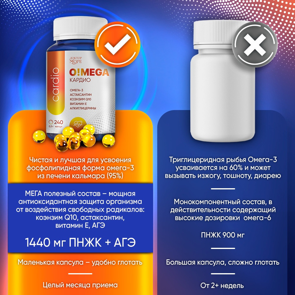 Комплекс «О!MEGA Кардио» — эффективное средство для укрепления здоровья сердечно-сосудистой системы и общего тонуса организма. Каждая капсула содержит высокоочищенную Омега-3 из печени кальмара, астаксантин, коэнзим Q10, витамин Е и алкилглицерины. Такой состав помогает улучшить работу сердца и сосудов, укрепляет иммунитет и замедляет процессы старения. |