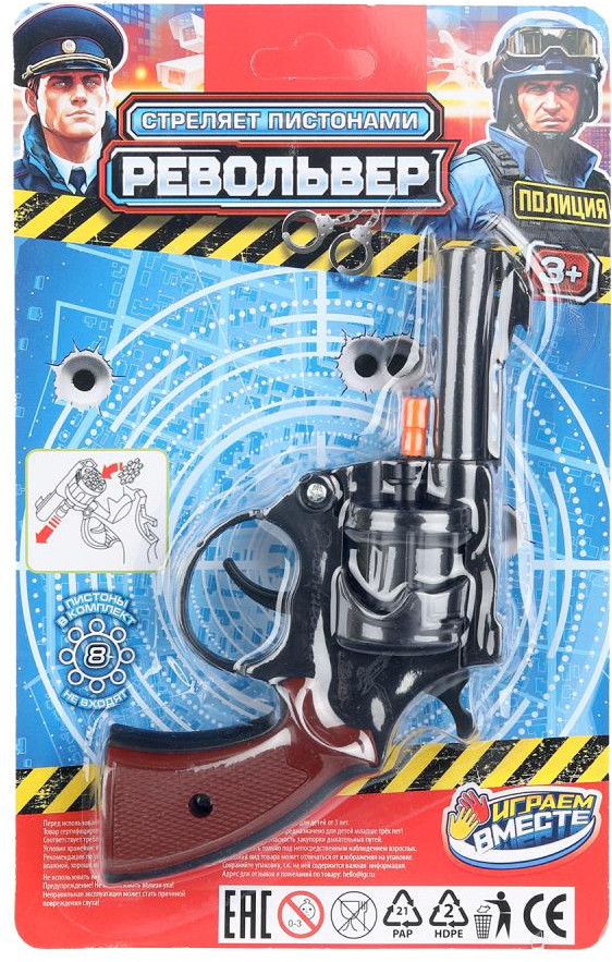 Револьвер для стрельбы пистонами ТМ «Играем вместе» непременно понравится юному герою. Игровое оружие с реалистичным звуком и лёгким дымовым эффектом станет любимой игрушкой вашего ребёнка. Револьвер легко заряжается и перезаряжается, нужно просто откинуть 8-зарядный барабан и установить кольцо с пистонами (приобретаются отдельно). На упаковке имеется схема установки пистонов. Игры с оружием ТМ «Играем вместе» помогут развить: координацию движений, воображение, внимание и моторику. |