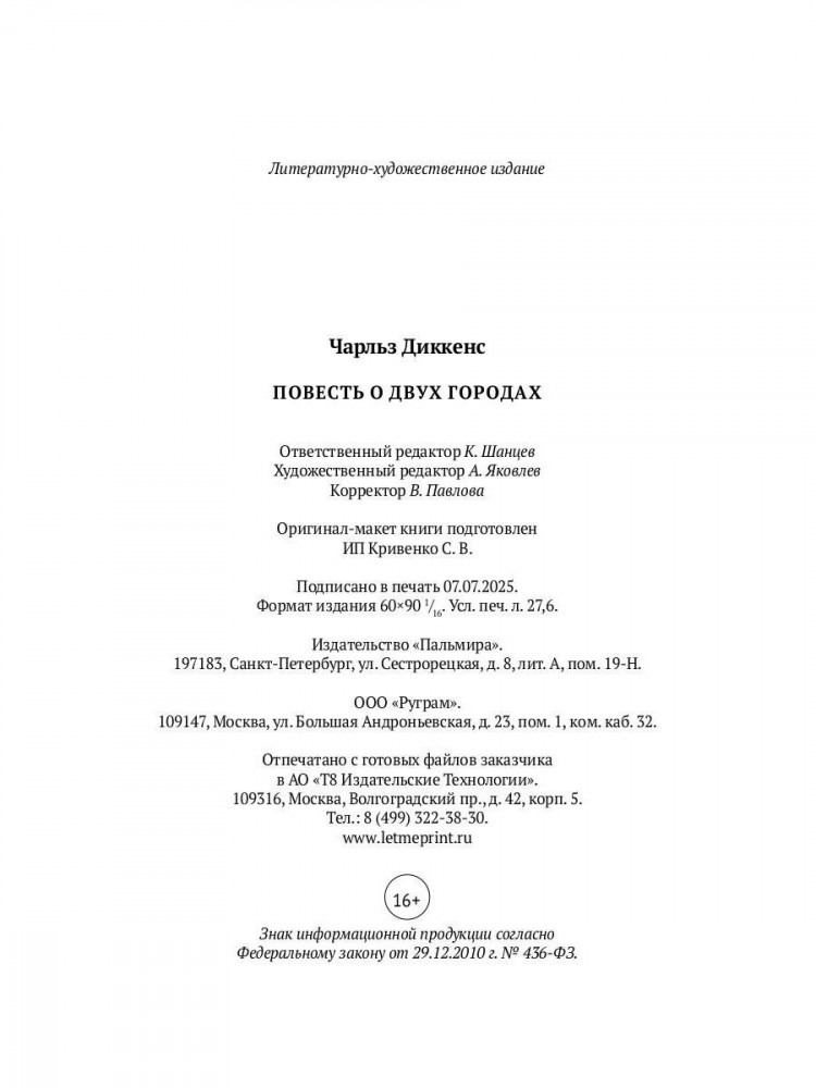 Серия: Пальмира — Диккенс Роман классика английской литературы Чарльза Диккенса (1812-1870) «Повесть о двух городах» рассказывает о трагических событиях Великой французской революции. Диккенс с психологической и художественной точностью изображает контраст между Парижем, где без остановки работает гильотина и голодают обездоленные, и Лондоном, в котором жизнь внешне идет спокойно и тоскливо. До какой степени отчаяния доведет героев революционная борьба? И смогут ли они избежать казни? |