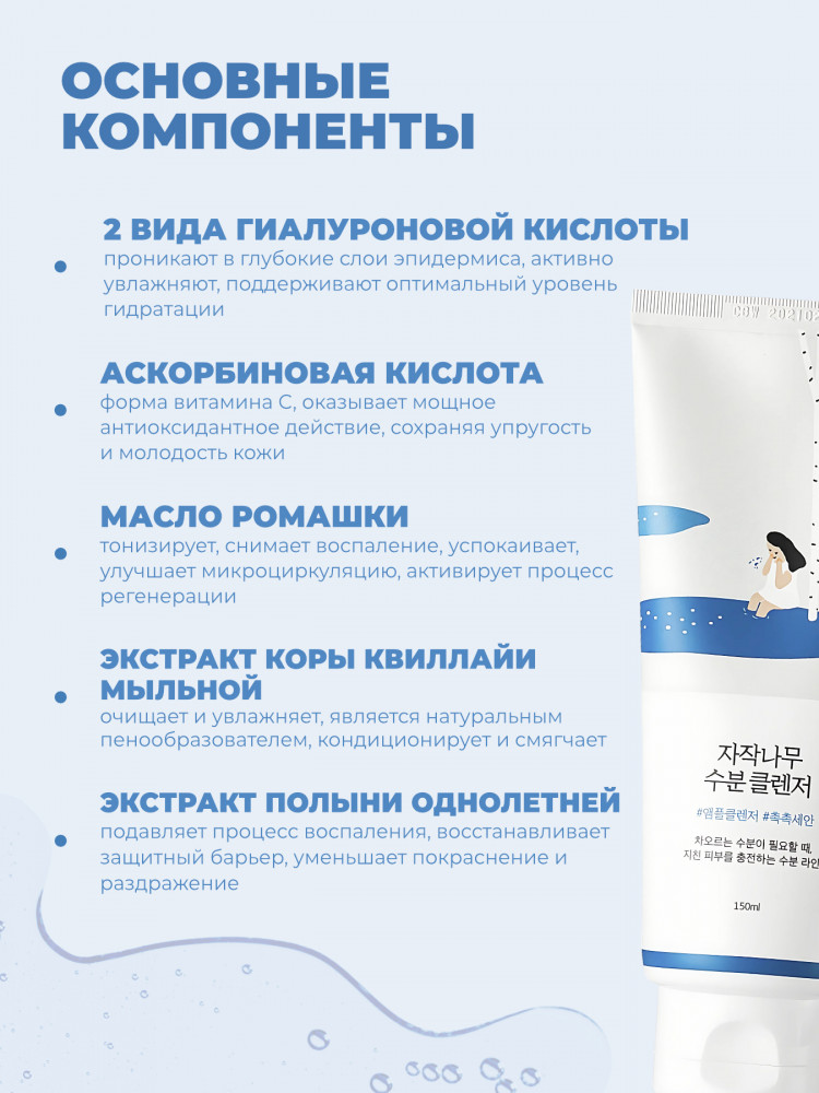 Средство с pH 5.0-6.0 и натуральными поверхностно-активными веществами на основе кокоса нормализует баланс влаги и липидов на поверхности кожи, имеет текстуру мягкого водянистого геля и аромат ромашки и полыни.