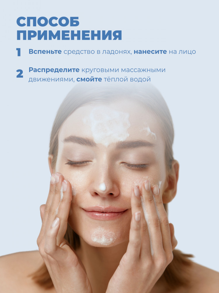Способ применения: вспеньте средство в ладонях, нанесите на лицо, распределите круговыми массажными движениями, смойте тёплой водой. Подходит для всех типов кожи.
