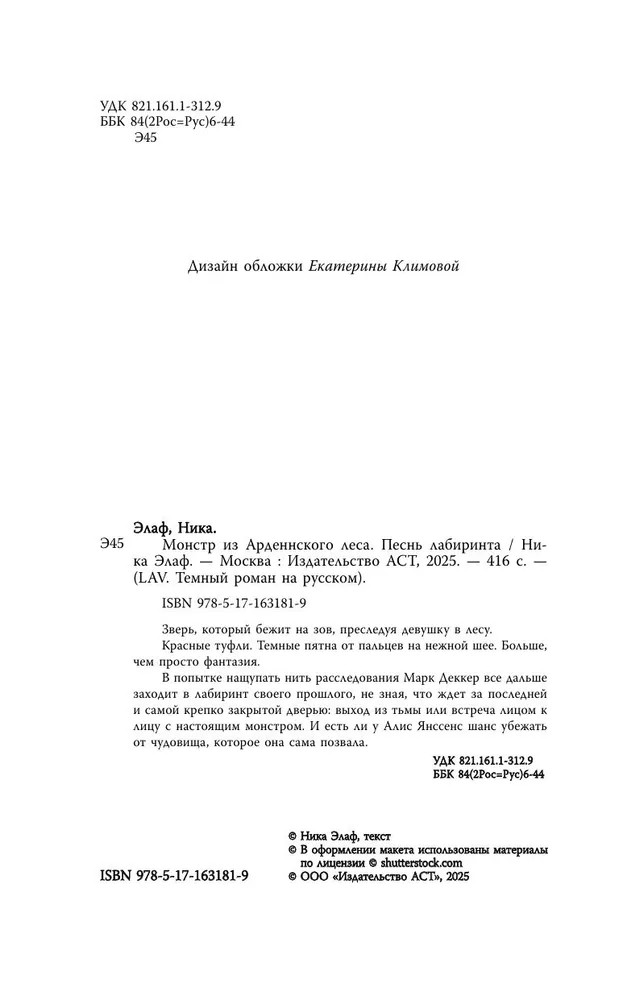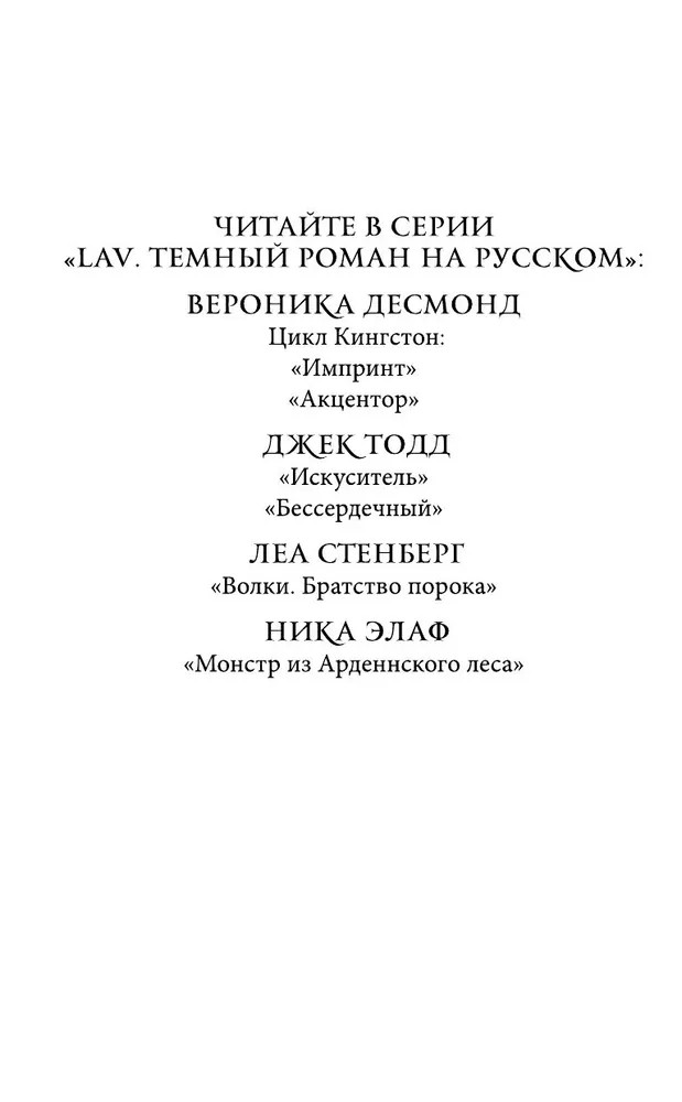 💳 Оплатить за товар можно при получении 🇰🇿 Есть бесплатная доставка по Казахстану от 1 дня 🎁 Копите бонусы с каждой покупки Серия: LAV. Темный роман на русском Зверь, который бежит на зов, преследуя девушку в лесу. Красные туфли. Темные пятна от пальцев на нежной шее. Больше, чем просто фантазия. В попытке нащупать нить расследования Марк Деккер все дальше заходит в лабиринт своего прошлого, не зная, что ждет за последней и самой крепко закрытой дверью: выход из тьмы или встреча лицом к лицу с настоящим монстром. И есть ли у Алис Янссенс шанс убежать от чудовища, которое она сама позвала. |