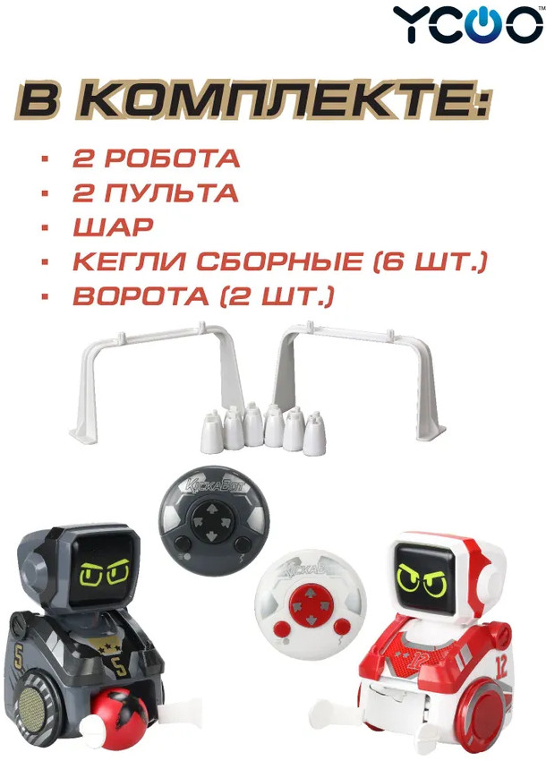 Приготовьтесь к самому захватывающему спортивному турниру вместе с этим неповторимым игровым набором! Превратите обычную игру в настоящий соревновательный футбольный матч или увлекательную игру в боулинг. Только вы и ваша команда можете привести мини-роботов к победе! В наборе 2 робота для захватывающих матчей с друзьями, а также футбольные мячи и кегли. |