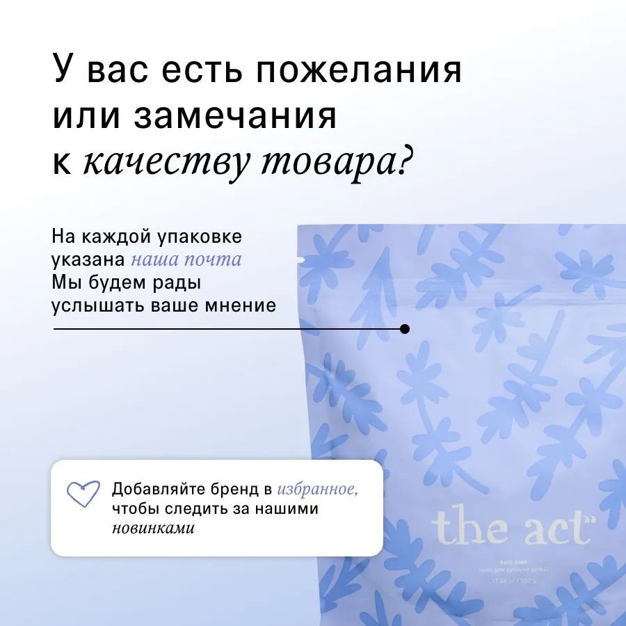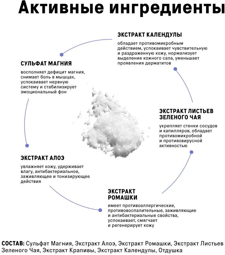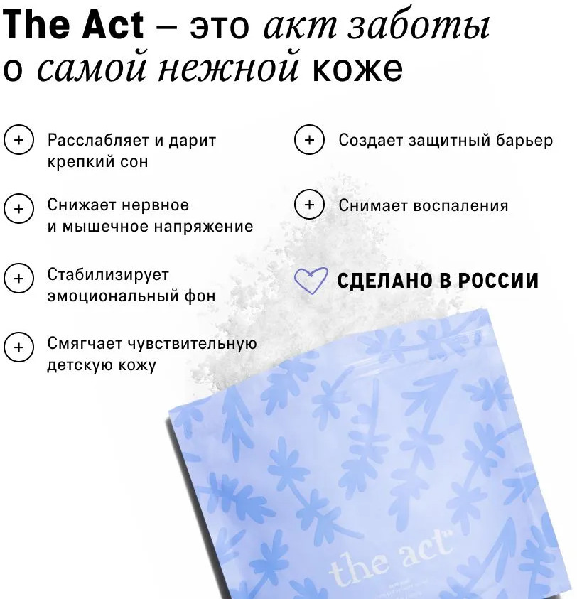 Новинка The Act — идеальное дополнение к колыбельной от мамы, ведь она содержит английскую магниевую соль и экстракты трав. Такой состав способствует спокойному сну ребенка и оказывает смягчающий эффект на нежную детскую кожу. Мы рекомендуем использовать продукт для малышей с трех лет. У средства для купания новорожденных безопасный состав на натуральных компонентах. Оно не содержит опасных веществ и потенциальных аллергенов. В составе 99% сульфата магния, который снимает напряжение после активного дня, а также смягчает детскую кожу и защищает её. Растительные экстракты питают, мягко очищая с головы до ног. При использовании нет необходимости в мыле.