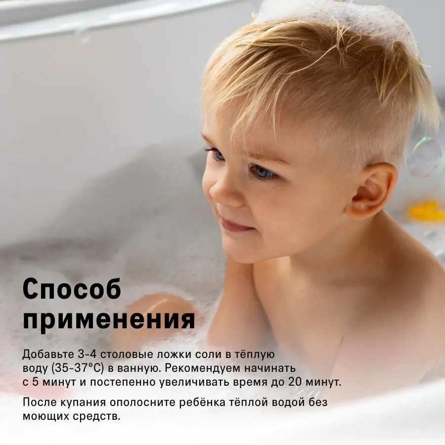 Способ применения: добавьте 3-4 столовые ложки соли в тёплую воду (35-37°С) и опустите ребёнка в ванную, вдыхая ароматные пары для дополнительного расслабляющего эффекта. Рекомендуем начинать с 5 минут и постепенно увеличивать время до 20 минут. После купания ополосните ребёнка тёплой водой без моющих средств, дайте выпить воды. |