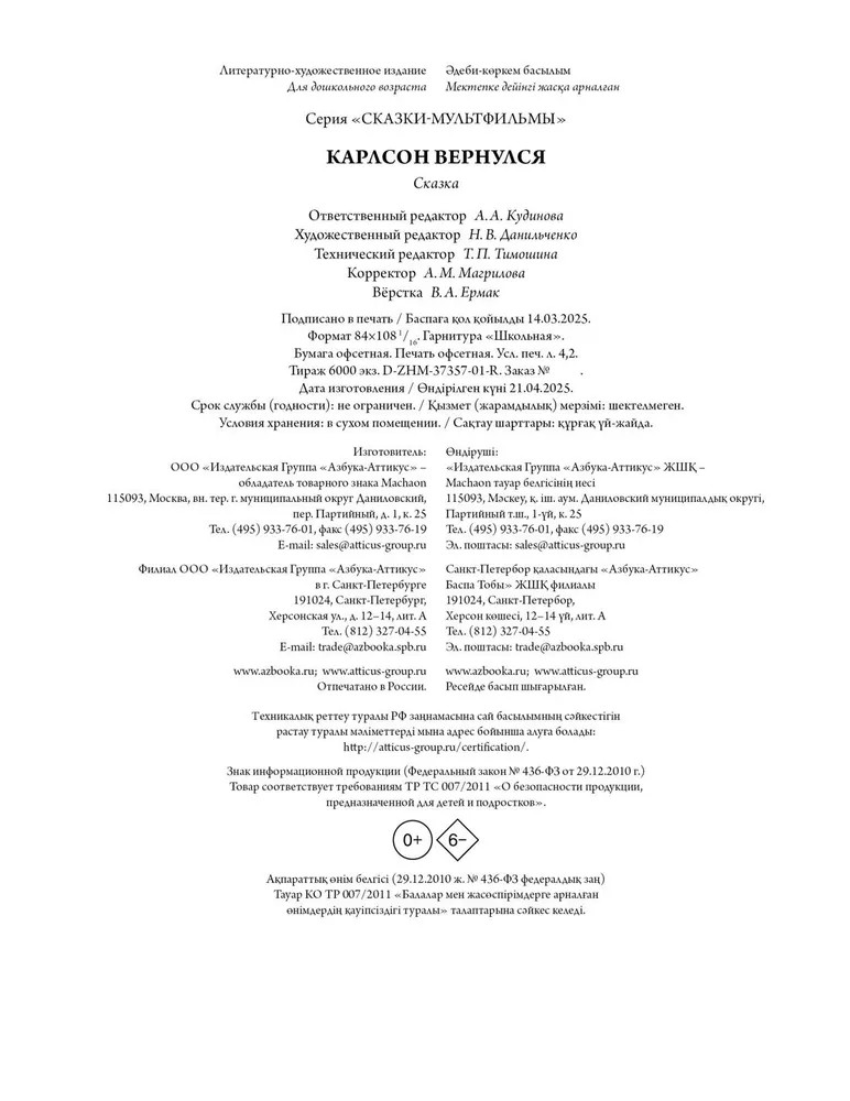 Серия: Сказки-мультфильмы Карлсон вернулся! И как раз вовремя. Малыш и так очень скучал по лучшему другу, а тут ещё и строгая домоправительница доводит до слёз: заставляет мыть руки и запрещает есть плюшки. Но Карлсона ни капельки не пугает сварливая фрёкен Бок, ведь он — лучший в мире укротитель домоправительниц! |