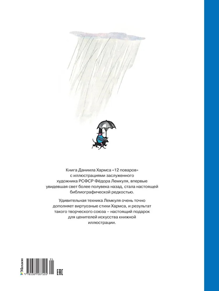 Серия: Шедевры детской литературы Книга Даниила Хармса «12 поваров» с иллюстрациями заслуженного художника РСФСР Фёдора Лемкуля, впервые увидевшая свет более полувека назад, стала настоящей библиографической редкостью. Удивительная техника Лемкуля очень точно дополняет виртуозные стихи Хармса, и результат такого творческого союза — настоящий подарок для ценителей искусства книжной иллюстрации. |