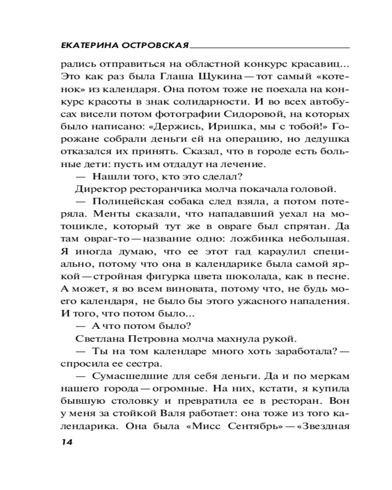 💳 Оплатить за товар можно при получении 🇰🇿 Есть бесплатная доставка по Казахстану от 1 дня 🎁 Копите бонусы с каждой покупки Серия: Татьяна Устинова рекомендует Двенадцать юных красавиц из провинциального Глинска снимаются для календаря, который расходится по всей стране, и не только получают деньги и славу, но и привлекают внимание маньяка. Одна за другой его жертвами становятся десять девушек, а потом наконец убийцу задерживают, судят и отправляют в тюрьму. Но тот ли человек оказался за решеткой? Проходят годы, и маньяк в Глинске вновь напоминает о себе, убивая одиннадцатую девушку из злосчастного календаря... |
