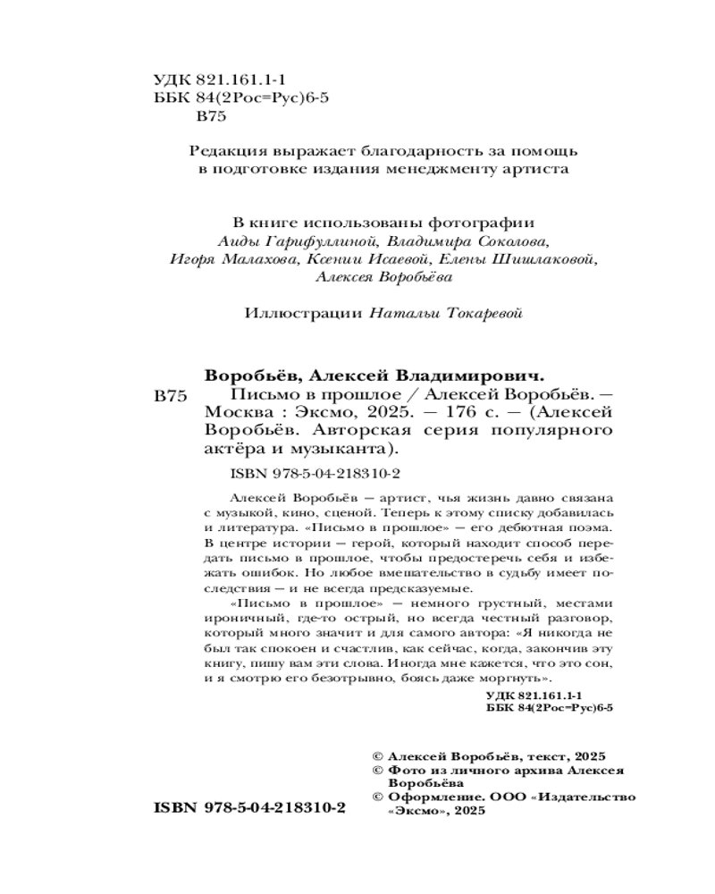 Серия: Алексей Воробьёв. Авторская серия популярного актёра и музыканта Алексей Воробьёв — артист, чья жизнь давно связана с музыкой, кино, сценой. Теперь к этому списку добавилась и литература. «Письмо в прошлое» — его дебютная поэма. В центре истории — герой, который находит способ передать письмо в прошлое, чтобы предостеречь себя и избежать ошибок. Но любое вмешательство в судьбу имеет последствия — и не всегда предсказуемые. |